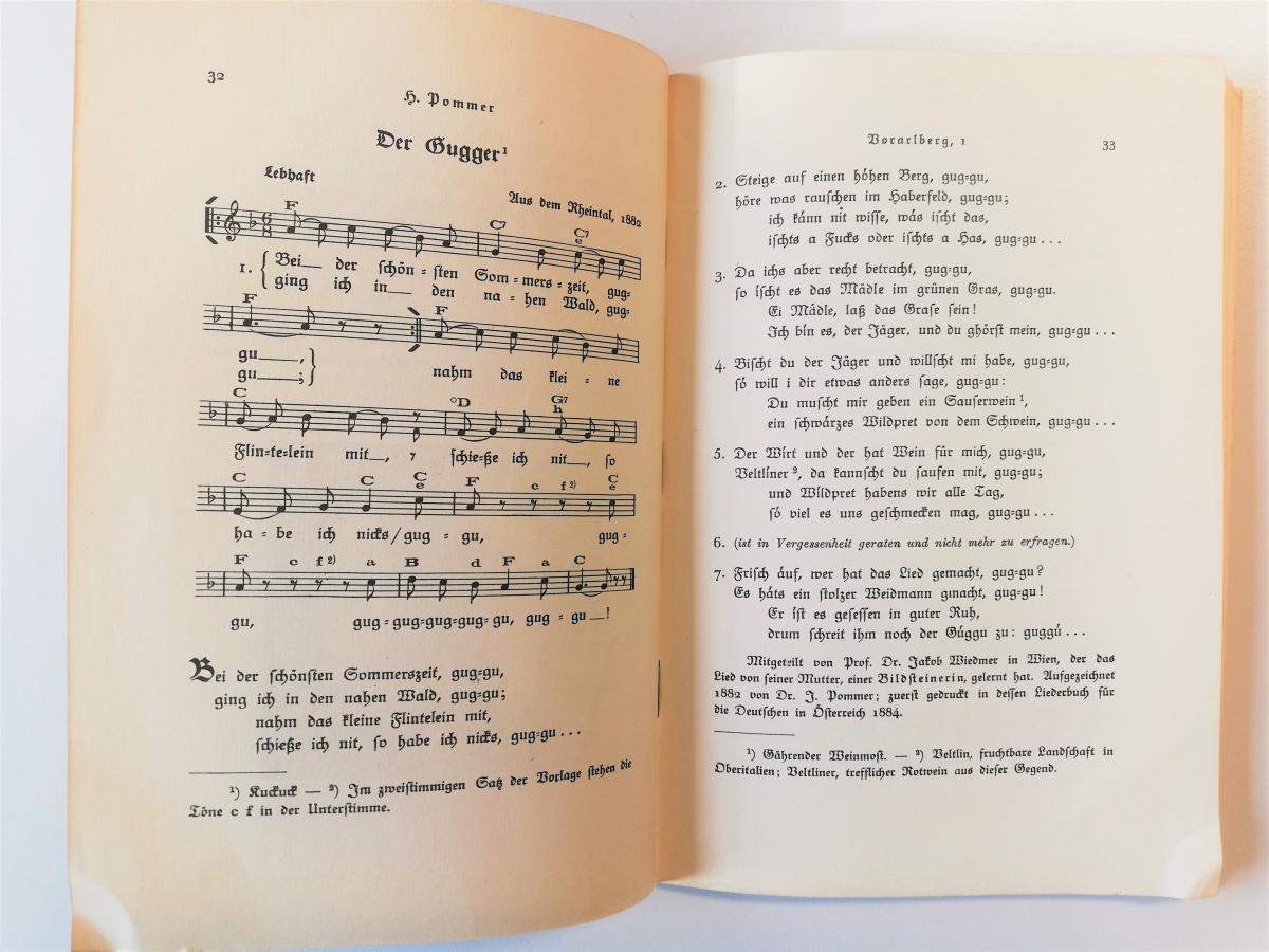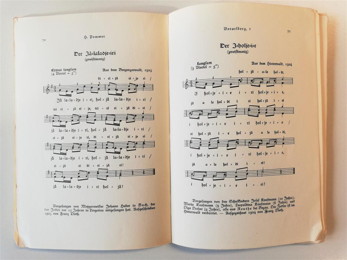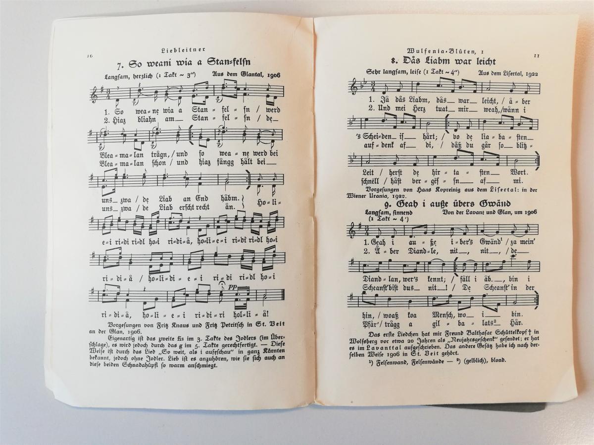 In addition to works by Beethoven, Mozart, Schubert, Stravinsky, Palestrina, Milhaud and Krenek's students and others, Ernst Krenek's private music library contains two books with folk songs: "Volkslieder und Jodler aus Vorarlberg" (Folks songs and Yodels from Vorarlberg), published in 1926, and "Wulfenia-Blüten. Some fifty songs and yodels from Carinthia", published in 1932 by Universal Edition; the latter named after the pretty Carinthian plantain "Wulfenia carinthiaca" which blossoms in early summer.