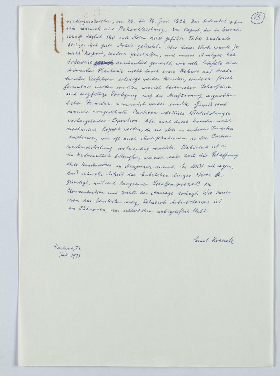 Für eine Radiosendung (November 1973) des Südwestfunks in Baden-Baden, analysierte Ernst Krenek Schuberts letztes Streichquartett. Unter äußerst dichter Illustration durch Beispiele beschreibt er harmonische und formale Details des Werks und schließt den Vortrag mit bewundernder Anerkennung von Schuberts „schlechthin unbegreiflichen“ Arbeitstempos.