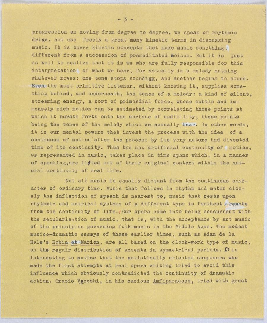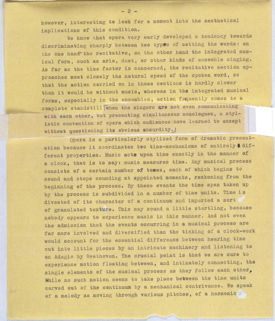 Opera is a particularly stylized form of dramatic present- ation because it coordinates two time-mechanisms of entirely dif- ferent properties. Music acts upon time exactly in the manner of a clock, that is to say: music measures time. Any musical process consists of a certain number of tones, each of which begins to sound and stops sounding at appointed moments, reckoning from the beginning of the process. By these events the time span taken up by the process is subdivided in a number of time units. Time is divested of its character of a continuum and imparted a sort of granulated texture. This may sound a little startling, because nobody appears to experience music in this manner. And not even the admission that the events occurring in a musical process are far more involved and diversified than the ticking of a clock-work would account for the essential difference between hearing time cut into little pieces by an intricate machinery and listening to an Adagio by Beethoven. The crucial point is that we are sure to experience motion floating between, and intimately connecting, the single elements of the musical process as they follow each other, While no such motion seems to take place between the time units carved out of the continuum by a mechanical contrivance. We speak of a melody as moving through various pitches, of a harmonic