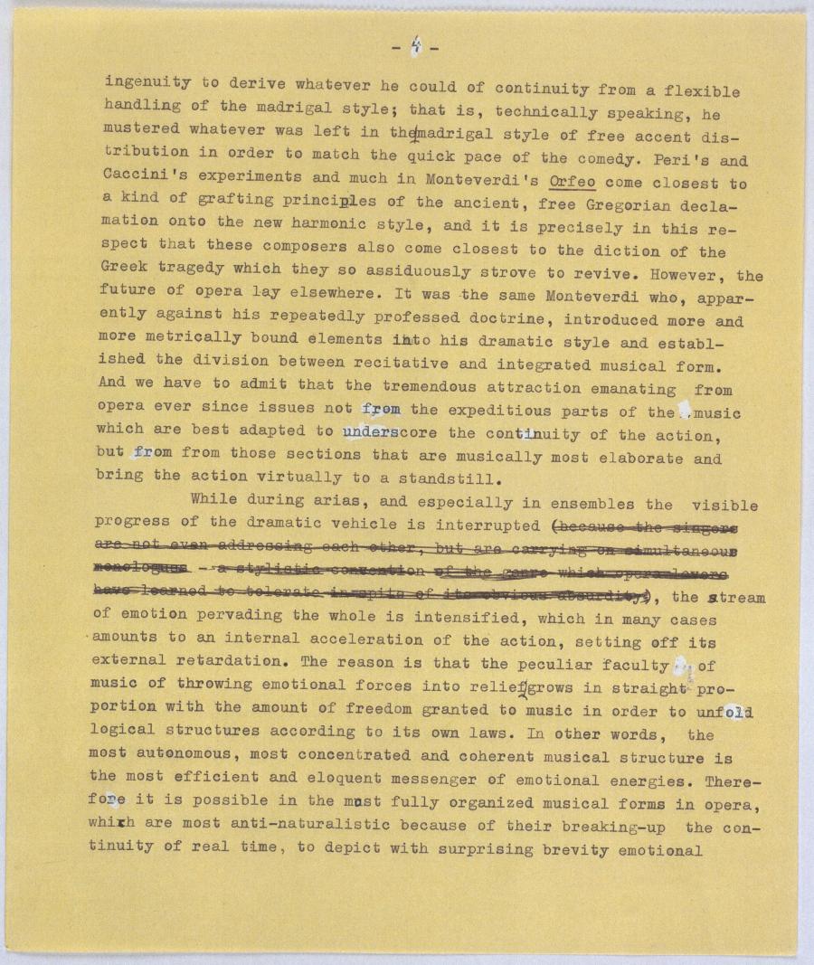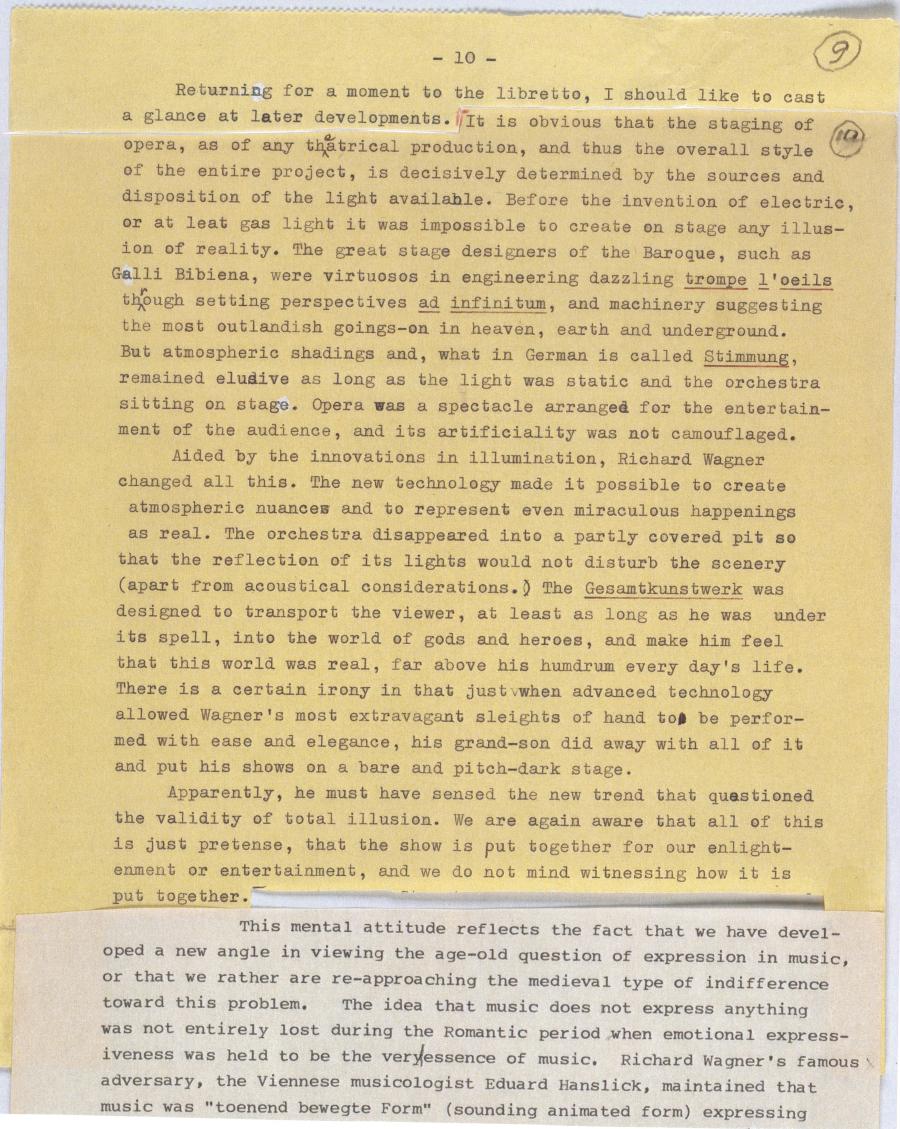 It seems that music, in the process of assimilating a text in order to produce an opera somehow brings it down from the lofty levels of literature. How, and exactly why does this happen? Every- body that has anything to do with opera knows that the application of music to a text extends the duration of the text to approximat- ely the triple of the duration of the same text if spoken without music. This is a very simple rule of the thumb that serves composers as well as librettists and hardly needs much explanation. It is,