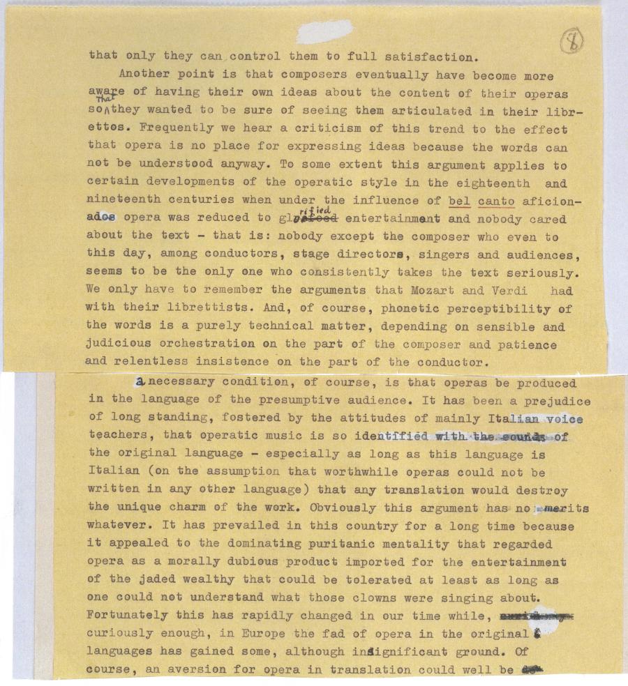 Another point is that composers eventually have become more aware of having their own ideas about the content of their operas so that they wanted to be sure of seeing them articulated in their libr- ettos. Frequently we hear a criticism of this trend to the effect that opera is no place for expressing ideas because the words can not be understood anyway. To some extent this argument applies to certain developments of the operatic style in the eighteenth and nineteenth centuries when under the influence of bel canto aficion- ados opera was reduced to gloefoedrified entertainment and nobody cared about the text - that is: nobody except the composer who even to this day, among conductors, stage directors, singers and audiences, seems to be the only one who consistently takes the text seriously. We only have to remember the arguments that Mozart and Verdi had with their librettists. And, of course, phonetic perceptibility of the words is a purely technical matter, depending on sensible and judicious orchestration on the part of the composer and patience and relentless insistence on the part of the conductor.