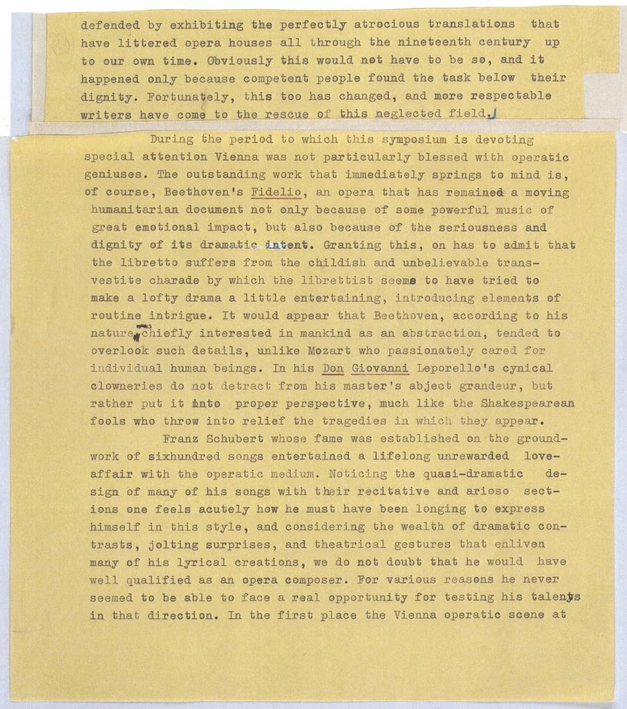 During the period to which this symposium is devoting special attention Vienna was not particularly blessed with operatic geniuses. The outstanding work that immediately springs to mind is, of course, Beethoven's Fidelio, an opera that has remained a moving humanitarian document not only because of some powerful music of great emotional impact, but also because of the seriousness and dignity of its dramatic intent. Granting this, on has to admit that the libretto suffers from the childish and unbelievable trans- vestite charade by which the librettist seems to have tried to make a lofty drama a little entertaining, introducing elements of routine intrigue. It would appear that Beethoven, according to his nature was chiefly interested in mankind as an abstraction, tended to overlook such details, unlike Mozart who passionately cared for individual human beings. In his Don Giovanni Leporellos cynical cloweries do not detract from his master's abject grandeur, but rather put it into proper perspective, much like the Shakespearean fools who throw into relief the tragedies in which they appear.
