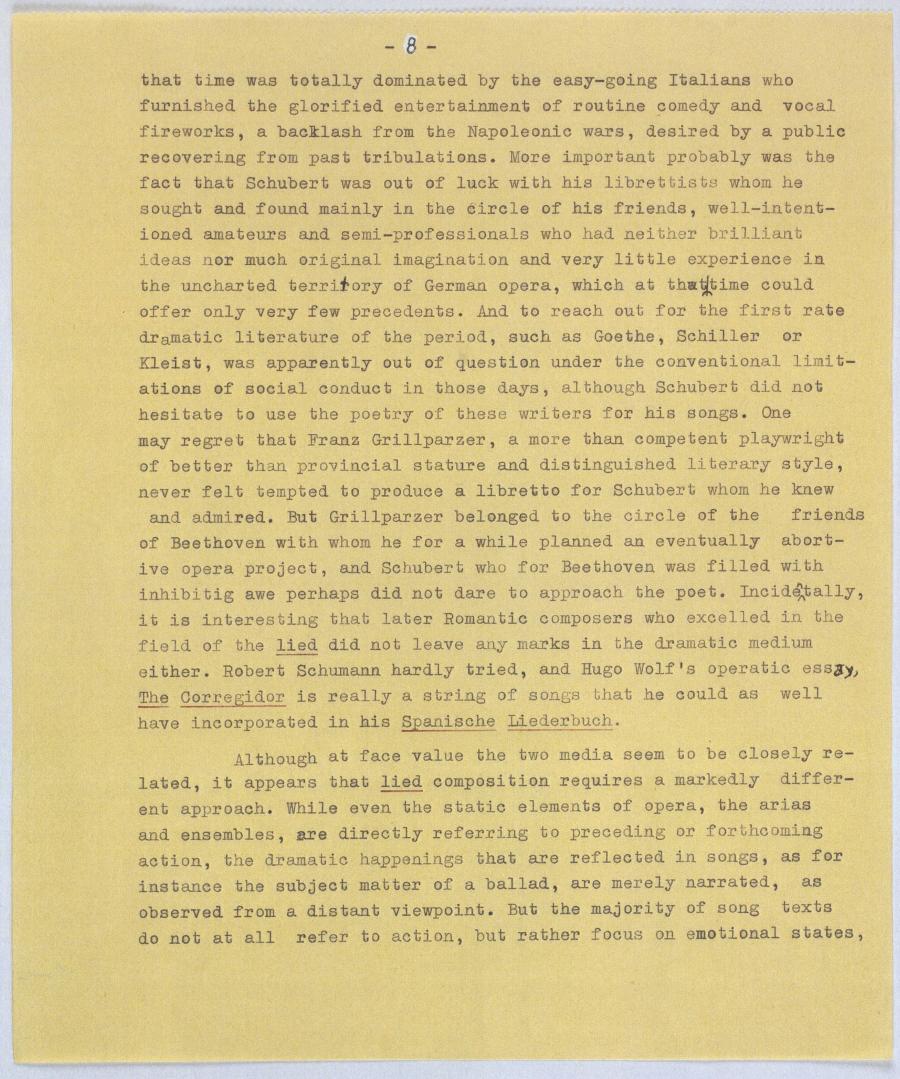 that time was totally dominated by the easy-going Italians who furnished the glorified entertainment of routine comedy and vocal fireworks, a backlash from the Napoleonic wars, desired by a public recovering from past tribulations. More important probably was the fact that Schubert was out of luck with his librettists whom he sought and found mainly in the circle of his friends, well-intent- ioned amateurs and semi-professionals who had neither brilliant ideas nor much original imagination and very little experience in the uncharted territory of German opera, which at that time could offer only very few precedents. And to reach out for the first rate dramatic literature of the period, such as Goethe, Schiller or Kleist, was apparently out of question under the conventional limit- ations of social conduct in those days, although Schubert did not hesitate to use the poetry of these writers for his songs. One may regret that Franz Grillparzer, a more than competent playwright of better than provincial stature and distinguished literary style, never felt tempted to produce a libretto for Schubert whom he knew and admired. But Grillparzer belonged to the circle of the friends of Beethoven with whom he for a while planned an eventually abort- ive opera project, and Schubert who for Beethoven was filled with inhibitig awe perhaps did not dare to approach the poet. Incidentally, it is interesting that later Romantic composers who excelled in the field of the lied did not leave any marks in the dramatic medium either. Robert Schumann hardly tried, and Hugo Wolf's operatic essay, The Corregidor is really a string of songs that he could as well have incorporated in his Spanische Liederbuch,