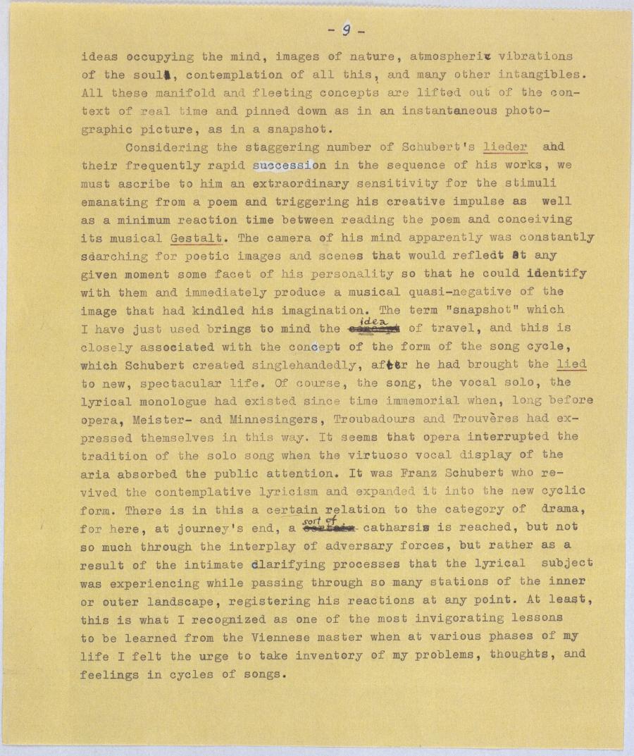 Considering the staggering number of Schubert's lieder and their frequently rapid succession in the sequence of his works, we must ascribe to him an extraordinary sensitivity for the stimuli emanating from a poem and triggering his creative impulse as well as a minimum reaction time between reading the poem and conceiving its musical Gestalt. The camera of his mind apparently was constantly searching for poetic images and scenes that would reflect at any given moment some facet of his personality so that he could identify with them and immediately produce a musical quasi-negative of the image that had kindled his imagination. The term "snapshot" which I have just used brings to mind the concept idea of travel, and this is closely associated with the concept of the form of the song cycle, which Schubert created singlehandedly, after he had brought the lied to new, spectacular life. Of course, the song, the vocal solo, the lyrical monologue had existed since time immemorial when, long before opera, Meister- and Minnesingers, Troubadours and Trouvères had ex- pressed themselves in this way. It seems that opera interrupted the tradition of the solo song when the virtuoso vocal display of the aria absorbed the public attention. It was Franz Schubert who re- vived the contemplative lyricism and expanded it into the new cyclic form. There is in this a certain relation to the category of drama, for here, at journey's end, a certain sort of catharsis is reached, but not so much through the interplay of adversary forces, but rather as a result of the intimate clarifying processes that the lyrical subject was experiencing while passing through so many stations of the inner or outer landscape, registering his reactions at any point. At least, this is what I recognized as one of the most invigorating lessons to be learned from the Viennese master when at various phases of my life I felt the urge to take inventory of my problems, thoughts, and feelings in cycles of songs.