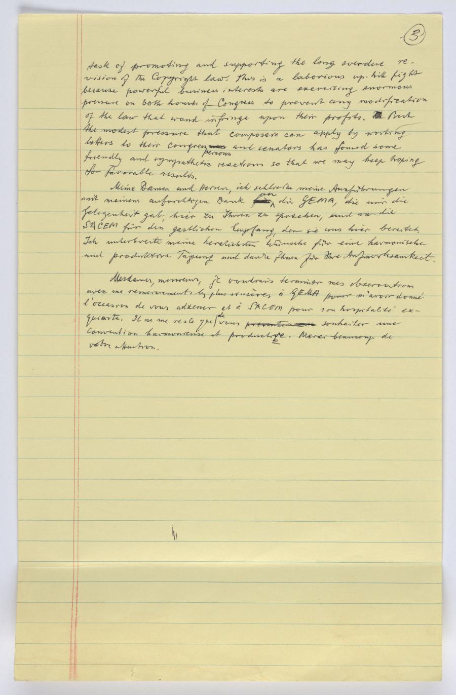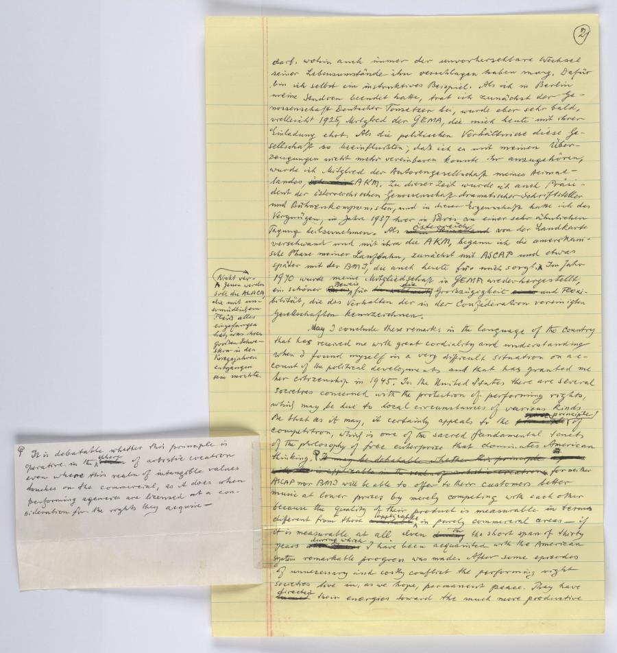 In seinen kurzen Grußworten bei einer Tagung der Confédération Internationale des Sociétés d´Auteurs et Compositeurs in Paris 1967 lobt Ernst Krenek aus der Perspektive eines international tätigen Komponisten die Bedeutung der Rechteverwertungsgesellschaften. Am Beispiel seiner eigenen Biographie beschreibt er freiwillige und erzwungene Wechsel zu unterschiedlichen Gesellschaften (ua. GEMA, AKM, ASCAP, BMI) und die spezielle Situation in den USA, wo mehrere Rechteverwertungsgesellschaften konkurrierten. Diese konzentrierten sich schließlich gemeinsam auf die Revision des US-Copyrights im Interesse der Urheber:innen, um der Einflussnahme der Musikindustrie auf die amerikanische Politik entgegenzuwirken.