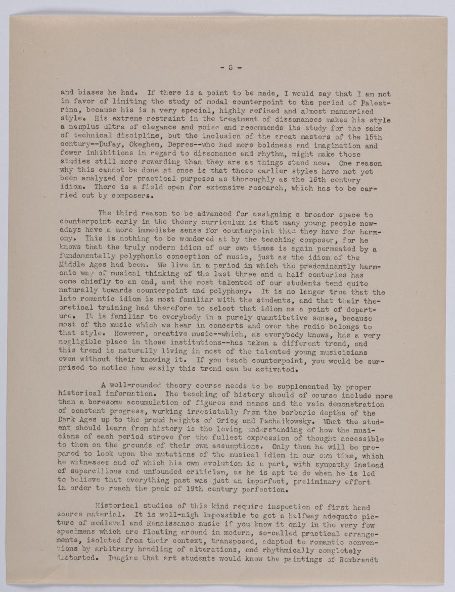 Für die Minnesota Music Teacher’s Association hielt Ernst Krenek in zeitlicher Nähe zu seinem Antritt der Professur an der Hamlin University eine Rede über den Anspruch von Musiktheoretischen Unterricht aus der Perspektive eines Komponisten. Kreneks Ansprüche umfassen handwerkliche Kompetenzen (Harmonielehre und Kontrapunkt), Kenntnisse der jeweiligen historischen Kontexte von unterschiedlichen Stilen, aber auch Lesefähigkeit in unterschiedlichen Sprachen (insbesondere Latein, aber auch Deutsch oder Französisch) um sich mit Quellen-Texten beschäftigen zu können. Und alles soll letztlich einer praktischen Umsetzung der musiktheoretischen Kompetenzen, namentlich dem Komponieren dienen, auch wenn die Studierenden letztlich nur eine Lehrbefugnis anstreben. „The very best should be just good enough for that profession, or else we will be forever frustrated in our attempts to maintain a real musical culture throughout the nation.“