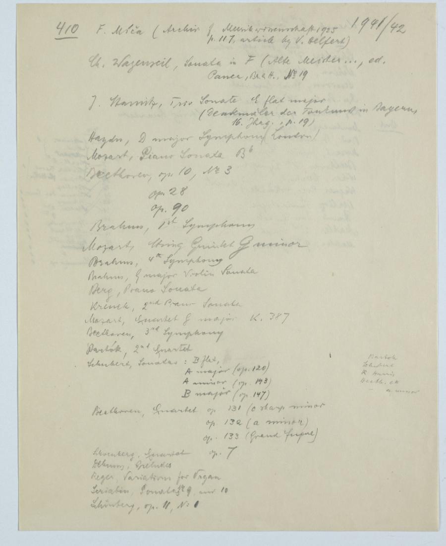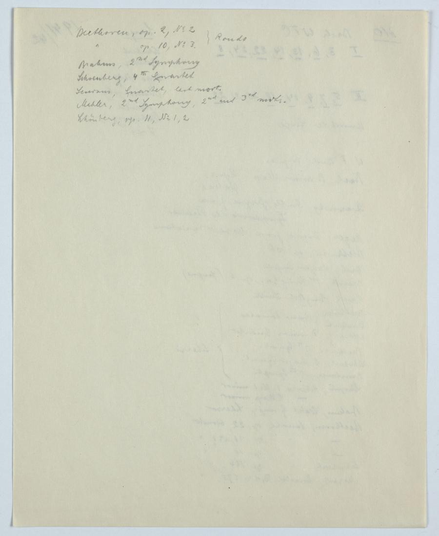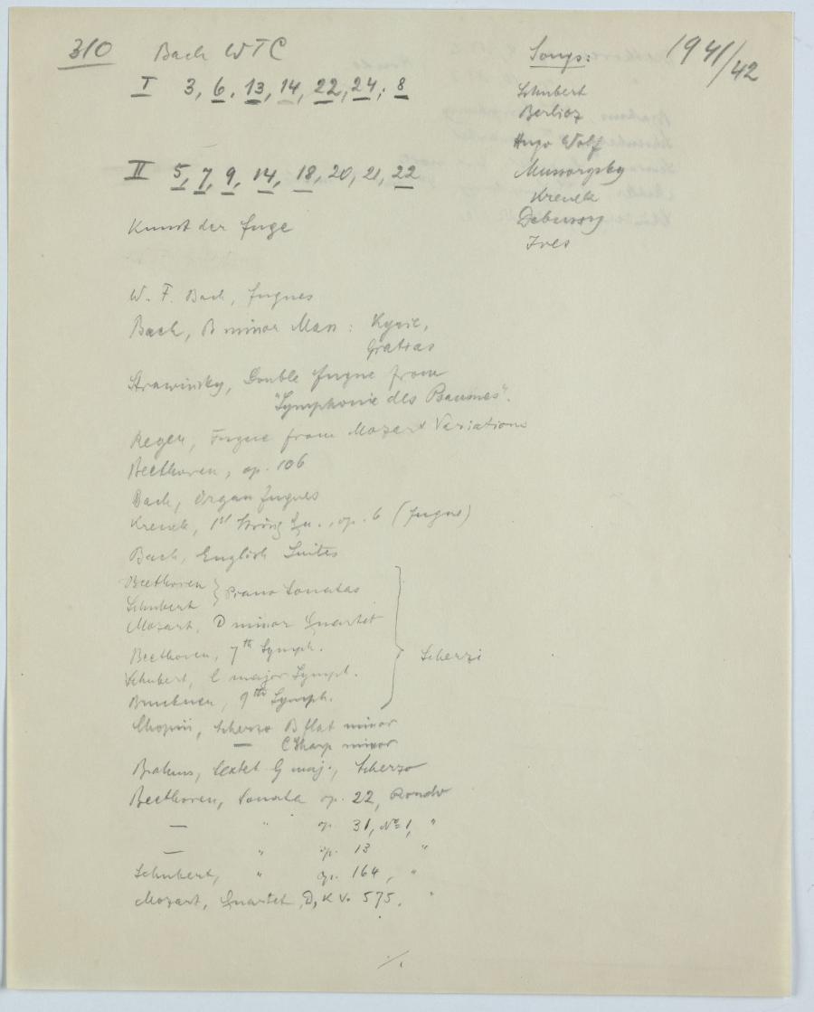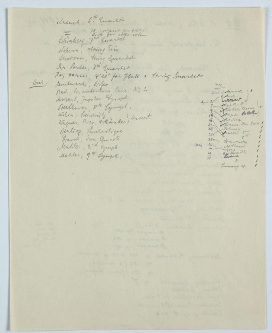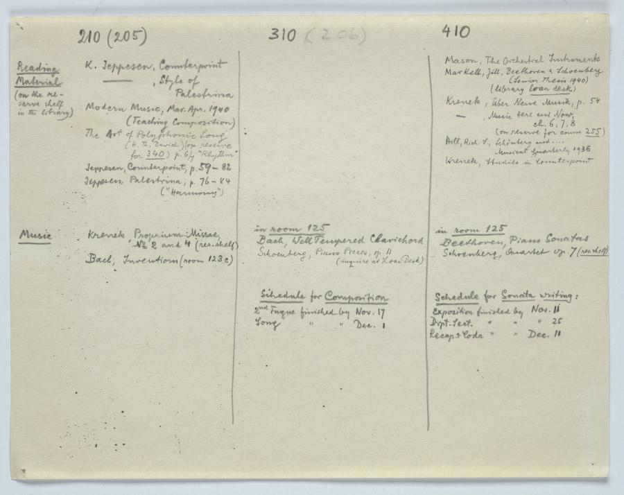 Zur Planung seiner am Vassar College im Studienjahr 1941/42 gehaltenen Kurse mit den Nummern 210, 310 und 410 machte sich Ernst Krenek Notizen zum vorgesehenen Repertoire und Hörbeispielen, und zu der für die Studierenden bereitgestellten Literatur und Notenausgaben. Für die in den Kursen 310 und 410 abzugebenden Kompositionsübungen machte er ebenfalls Pläne.