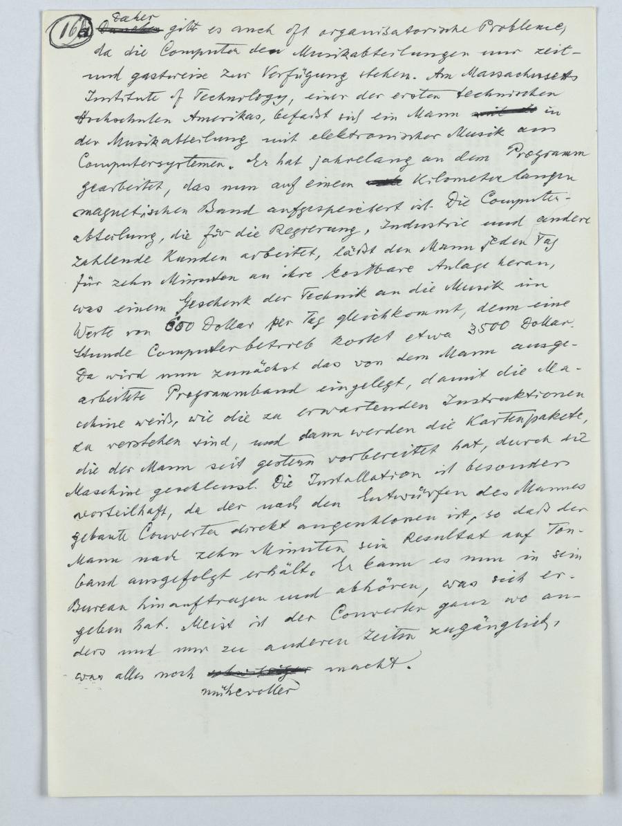 Für den Komponisten besteht eine Hauptschwierigkeit darin, daß er die Klänge, die er schließlich als Bestand- teile seines Werkes auf Tonband aufnehmen will, nicht hören kann, bevor sie auf dem Band sind. Da das Ver- fahren keine Frequenzgeneratoren verwendet, weil die klangerzeugenden magnetischen Konstellationen durch stumme Übertragung elektronischer Impulse entstehen, kann man nur das fertige Produkt hören, und wenn man etwas korrigieren will, muß man neue Karten anfertigen und den ganzen Prozess wiederholen.