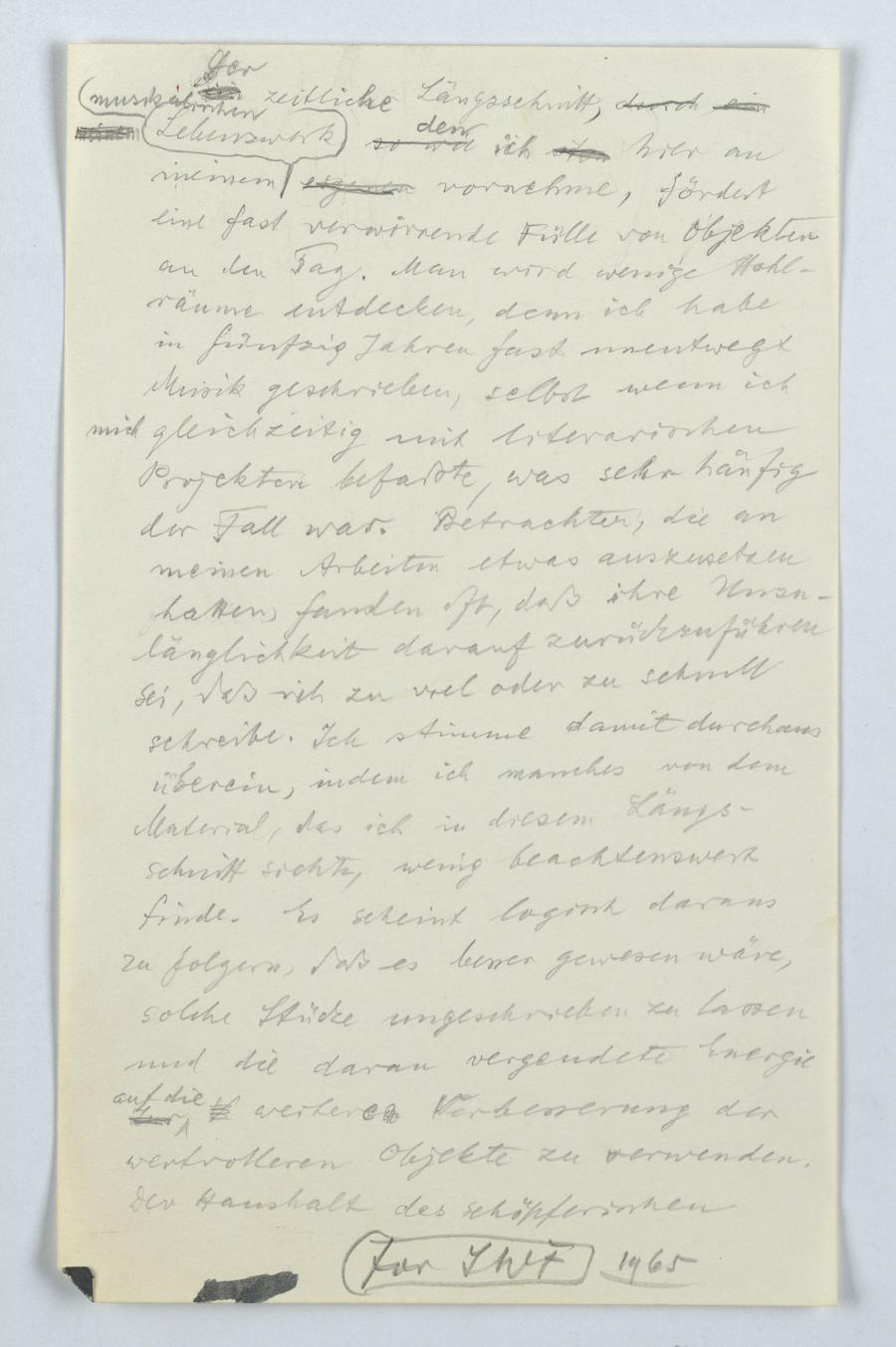 Ein Der zeitliche Längsschnitt, durch ein meinem so wie den ich hier an meinem musikalischen Lebenswerk eigenen vornehme, fördert eine fast verwirrende Fülle von Objekten an den Tag. Man wird wenige Hohl- räume entdecken, denn ich habe in fünfzig Jahren fast unentwegt Musik geschrieben, selbst wenn ich mich gleichzeitig mit literarischen Projekten befaßte, was sehr häufig der Fall war. Betrachter, die an meinen Arbeiten etwas auszusetzen hatten, fanden oft, daß ihre Unzu- länglichkeit darauf zurückzuführen sei, daß ich zu viel oder zu schnell schreibe. Ich stimme damit durchaus überein, indem ich manches von dem Material, das ich in diesem Längs- schnitt sichte, wenig beachtenswert finde. Es scheint logisch daraus zu folgern, daß es besser gewesen wäre, solche Stücke ungeschrieben zu lassen. und die daran vergeudete Energie Zur auf die weiteren Verbesserung der vertvolleren Objekte zu verwenden. Der Haushalt des schöpferischen