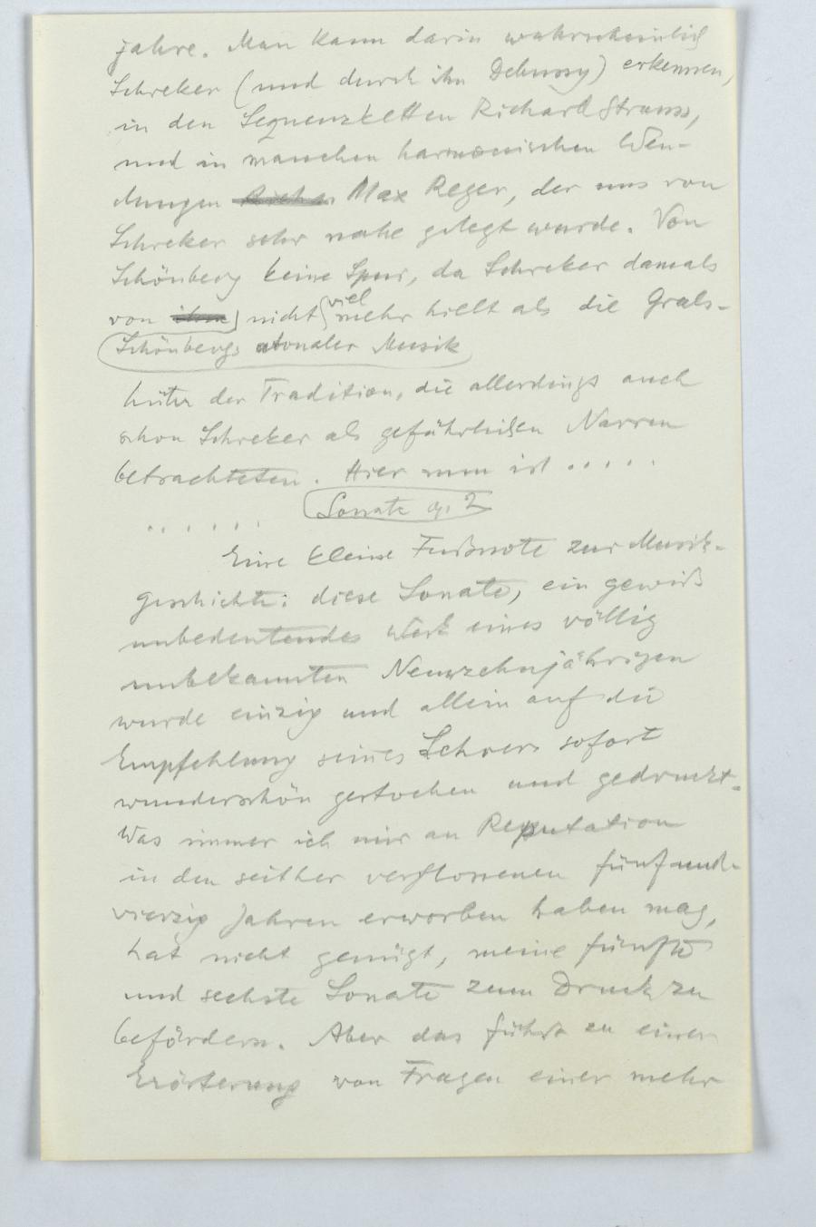 Eine kleine Fußnote zur Musik- geschichte: diese Sonate, ein gewiß unbedeutendes Werk eines völlig unbekannten Neunzehnjährigen wurde einzig und allein auf die Empfehlung seines Lehrers sofort wunderschön gestochen und gedruckt. Was immer ich nur an Reputation in den seither verflossenen fünfund- vierzig Jahren erworben haben mag, hat nicht genügt, meine fünfte und sechste Sonate zum Druck zu befördern. Aber das führt zu einer Erörterung von Fragen einer mehr