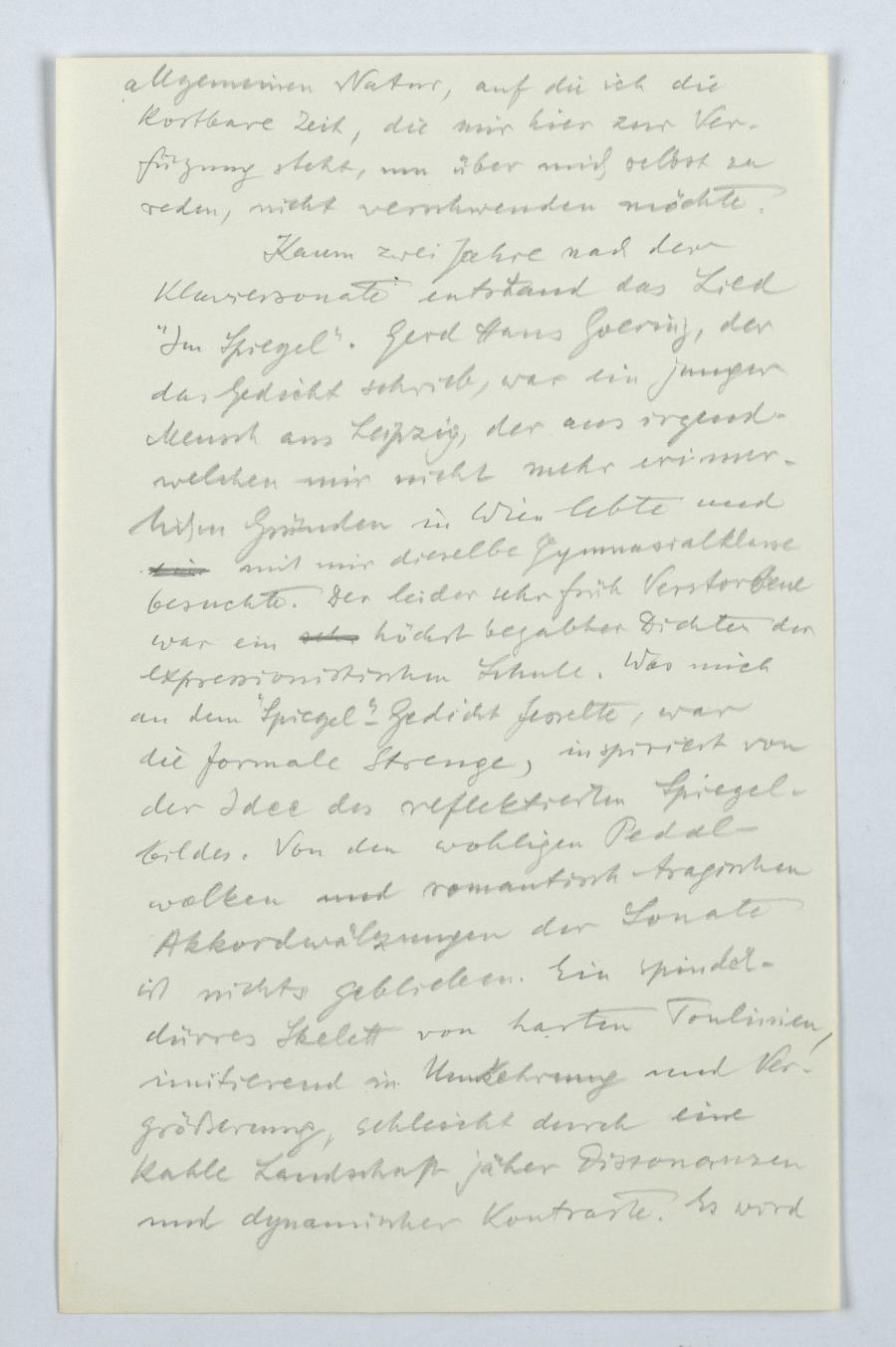 Kaum zwei Jahre nach der Klaviersonate entstand das Lied "Im Spiegel". Gerd Hans Goering, der das Gedicht schrieb, was ein junger Mensch aus Leipzig, der aus irgend- welchen mir nicht mehr erinner- lichen Gründen in Wien lebte und mit mir dieselbe Gymnasialklasse besuchte. Der leider sehr früh Verstorbene war ein sehr höchst begabter Dichter der expressionistischen Schule. Was mich an dem "Spiegel"-Gedicht fesselte, war die formale Strenge, inspiriert von der Idee des reflektierten Spiegel- bildes. Von den wohligen Pedal- wolken und romantisch-tragischen Akkordwälzungen der Sonate ist nichts geblieben. Ein spindel- dürres Skelett von harten Tonlinien, imitierend in Umkehrung und Ver- größerung, schleicht durch eine kahle Landschaft jäher Dissonanzen und dynamischer Kontraste. Es wird