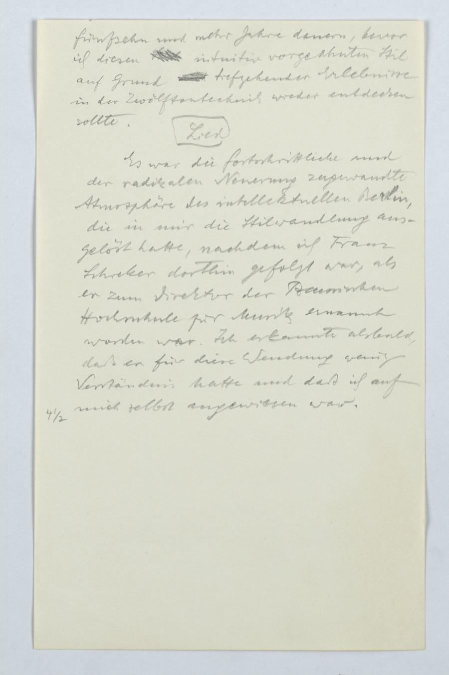 Es war die fortschrittliche und der radikalen Neuerung zugewandte Atmosphäre des intellektuellen Berlin, die in mir die Stilwandlung aus- gelöst hatte, nach dem ich Franz Schreker dorthin gefolgt war, als er zum Direktor der Preussischen Hochschule für Musik ernannt worden war. Ich erkannte alsbald daß er für diese Wendung wenig Verständes hatte und daß ich auf mich selbst angewiesen war.