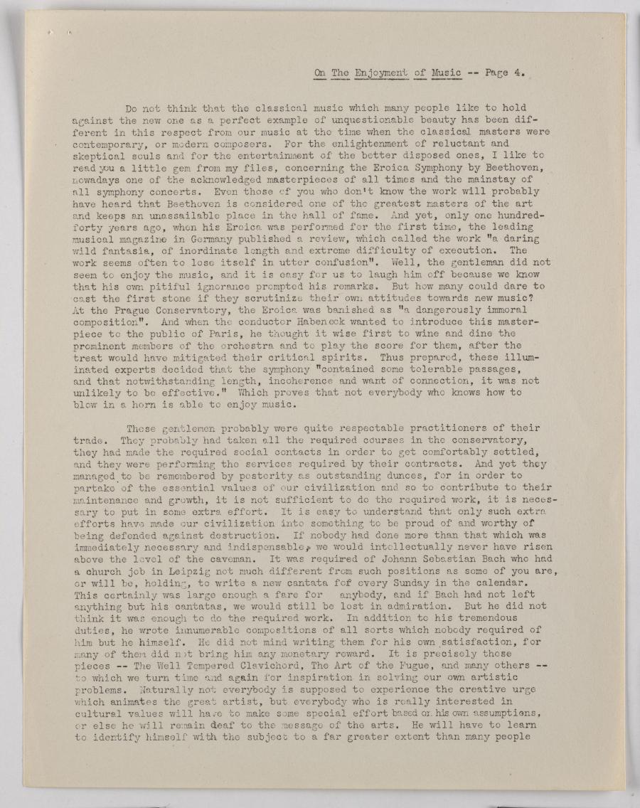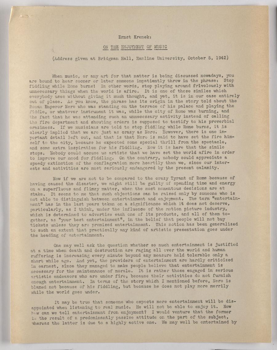 Zu Beginn seiner Tätigkeit an der Hamline University hielt Krenek einen Vortrag, der sich mit Unterhaltung vs. Genuß („entertainment“ vs. „enjoyment“) in Bezug auf Neue Musik auseinandersetzt. Die häufig bemühte Unterscheidung zwischen Hören und Zuhören („hearing“ und „listening“) benutzt Krenek hier als Brücke zum bewussten kreativen Prozess der aktiven Musikrezeption, der notwendigerweise für den Genuß von Neuer Musik von den Zuhörenden aufgebracht werden müsste. Dass dies auch in der Vergangenheit nicht selbstverständlich aufbracht wurde, illustriert Krenek am Beispiel von zeitgenössischen Reaktionen auf Beethovens Eroica-Symphonie.