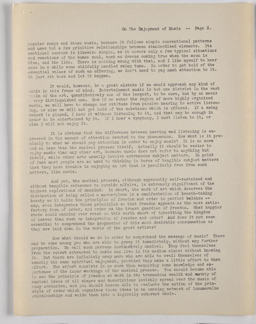 On The Enjoyment of Music -- Page 2.popular songs and dance music, because it follows simple conventional patterns and uses but a few primitive relationships between standardized elements. Its emotional content is likewise simple, as it covers only a few typical situations and reactions of the human soul, such as dreams coming true when the moon is blue, and the like. There is nothing wrong with that, and I like myself to hear once in a while some skilfully handled swing tune. In order to get hold of the essential values of such an offering, we don't need to pay much attention to it. We just sit back and let it happen.