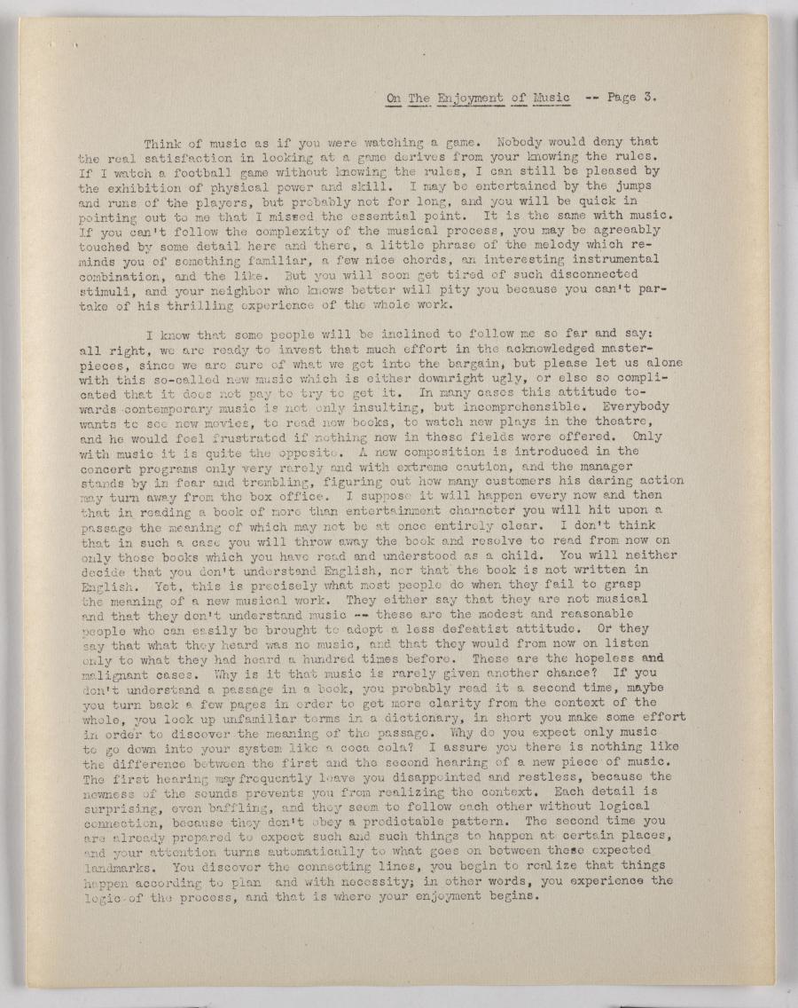 It is obvious that the difference between hearing and listening is ex- pressed in the amount of attention devoted to the phenomenon. Now what is it pre- cisely to what we should pay attention in order to enjoy music. It is no more and no less than the musical process itself. Actually it should be easier to enjoy music than any other art, because music does not refer to anything but itself, while other arts usually involve extraneous subject matters. In point of fact most people are so used to thinking in terms of tangible subject matters that they have trouble in enjoying an art that is peculiarly free from such matters, like music.