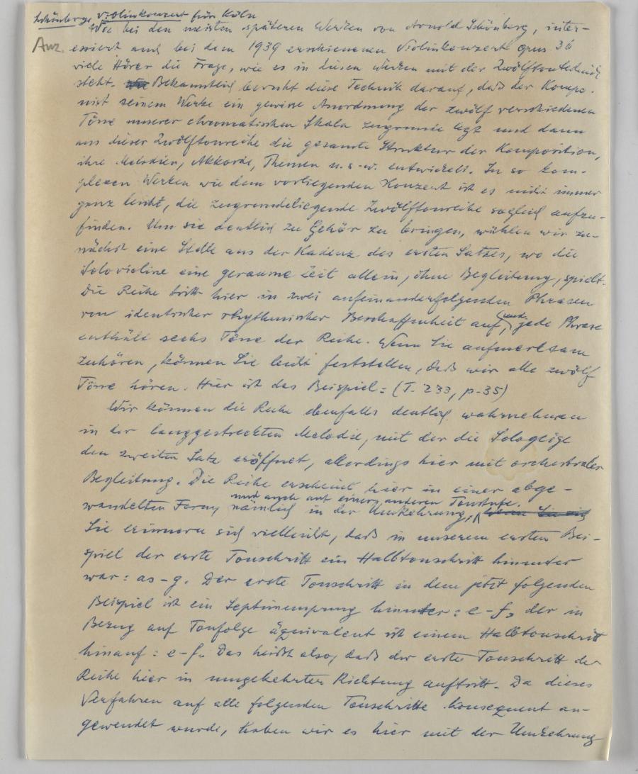 In dieser kurzen Werkeinführung – vermutlich für eine Übertragung des Violinkonzerts von Arnold Schönberg, op. 36 im Radioprogramm des WDR im Jahr 1963 – erläutert Ernst Krenek die Umsetzung der Zwölftontechnik in diesem Werk. Mit mehreren Hörbeispielen demonstriert er die verwendeten Tonreihen und deren Modifikationen und wie sich aus diesem musikalischen Material unterschiedliche Charaktere gewinnen lassen. Er beendet seine Ausführungen mit einer kurzen Beschreibung der formalen Aspekte des dreisätzigen Werks.