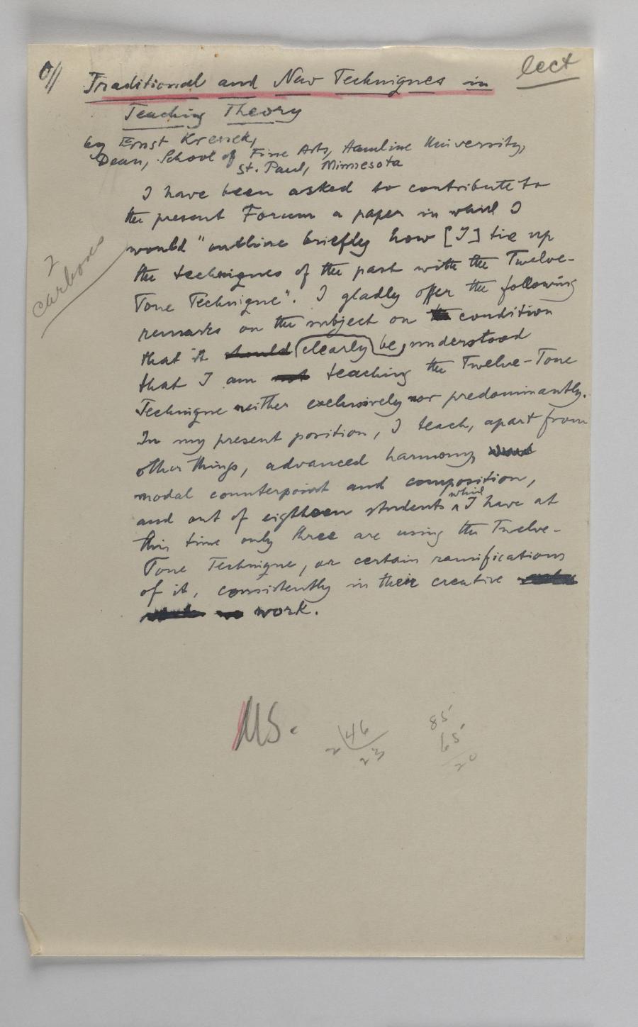 Für eine Konferenz der Music Teachers' National Association im May 1943 präsentierte Krenek eine auf seinen eigenen Erfahrungen basierende Auseinandersetzung mit den Möglichkeiten und Vorteilen der Integration von Zwölfton-Techniken in den Musiktheorie-Unterricht. Sein Vortrag umfasste die kurze historische Entwicklung der Komposition mit zwölf Tönen am Modell Arnold Schönbergs und erwähnt einige grundlegende theoretische Studien dazu.