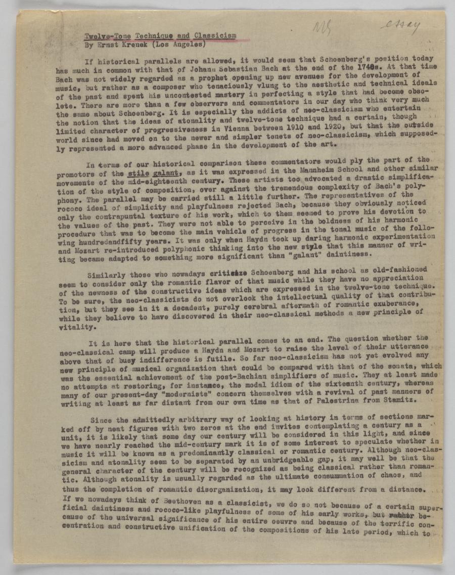In diesem Kontext entstand dieser Vortrag, der historische Parallelen zwischen den jeweils unterschiedlichen aber zeitgleichen kompositorischen Ausprägungen von J S Bachs Spätwerk und dem „stile galante“ der Mannheimer Schule, bzw. von A Schönbergs Zwölftonkomposition und dem Neoklassizismus. Krenek argumentiert für die Langlebig- und Entwicklungsfähigkeit der Zwölftontechnik, die potentiell zu einem neuen Klassizismus führen kann, im Gegensatz zum Neoklassizismus, dem Krenek trotz seiner damals aktuellen Popularität nur als Modetrend einschätzt.