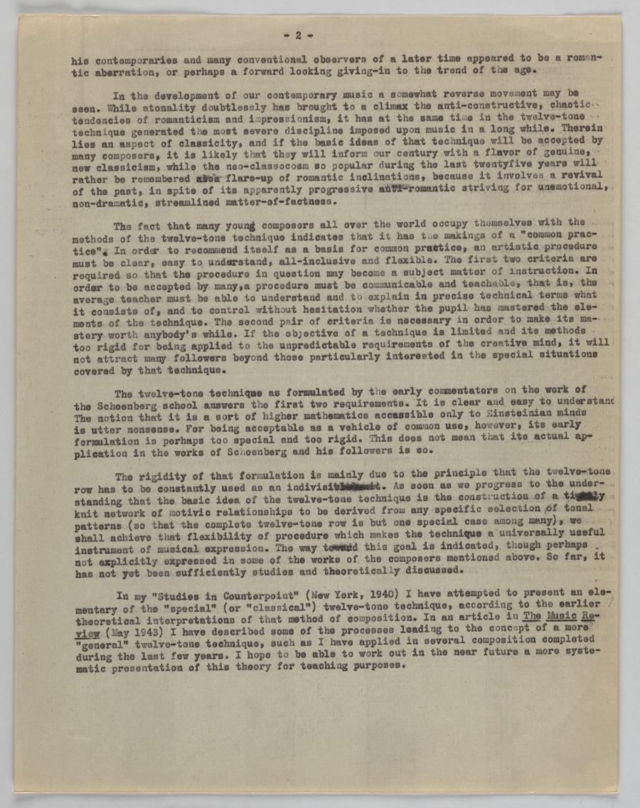 In the development of our contemporary music a somewhat reverse movement may be seen. While atonality doubtlessly has brought to a climax the anti-constructive, chaotic tendencies of romanticism and impressionism, it has at the same time in the twelve-tone technique generated the most severe discipline imposed upon music in a long while. Therein lies an aspect of classicity, and if the basic ideas of that technique will be accepted by many composers, it is likely that they will inform our century with a flavor of genuine, new classicism, while the neo-classocosm so popular during the last twentyfive years will rather be remembered assa flare-up of romantic inclinations, because it involves a revival of the past, in spite of its apparently progressive anti-romantic striving for unemotional, non-dramatic, streamlined matter-of-factness.