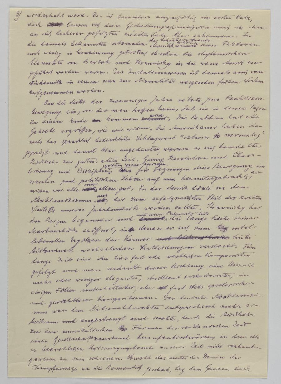 In allen diesen Bestrebungen handelte es sich im rein mu- sikalischen Sinn um Reaktion, denn ihnen allen war gemeinsam eine Abwendung von der neuen, sogenannt atonalen Tonsprach und eine Wiederbelebung tonsprachlicher Elemente der Ver- gangenheit, mit verschiedenen Vorzeichen und zu verschiedenen Graden. Die modernen Errungenschaften, d.h. hauptsächlich die Dissonanzen, wurden nicht ganz aufgegeben, aber im Wesentlichen mehr als pikante Zutaten denn als Grundsubstanz verwendet.