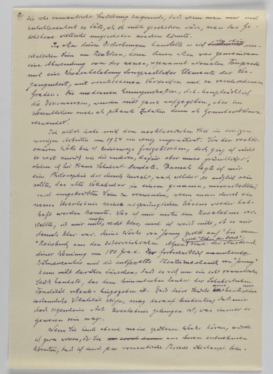 gegangen bin. Ich weiß, daß manche Beurteiler den Bruch so er- heblich finden, daß sie ärgerlich erklären, man könne mir überhaupt nichts glauben. Andere sagen, daß ich im Wesentlichen überhaupt nie von jemand anderem als Franz Schubert beeinflußt worden sei, gleichgültig in welchen Stil ich schreibe. Ich kann das selbst nicht klären, obschon es mir scheint, daß die neuen Werke jedenfalls sehr anders klingen als die der romantische Zwischenperiode und in manchen Punkten eher an die Frühwerke erinnern.