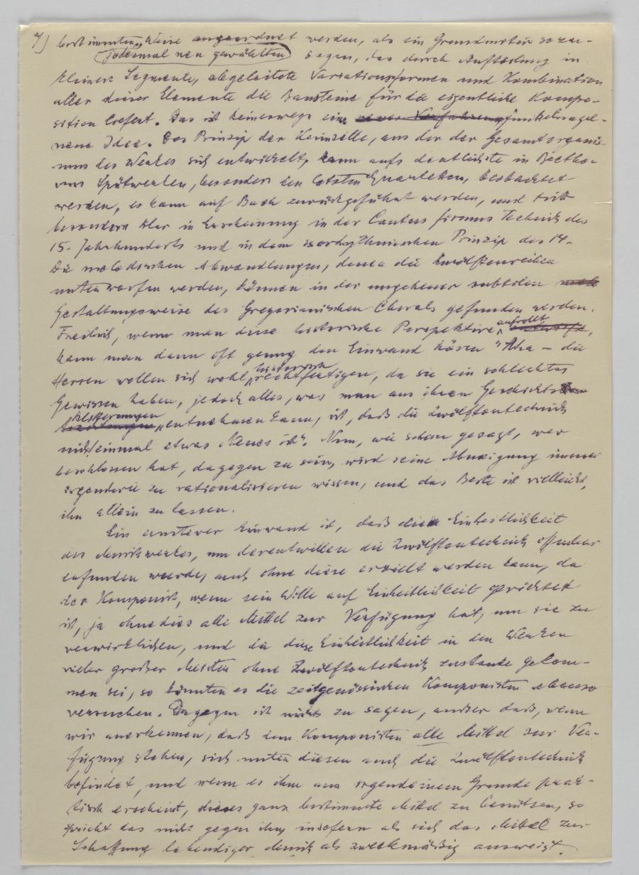 Was nun die Zwölftontechnik als solche betrifft, so kann sie nur einem sehr oberflächlichen Blick als ein mathematisch gebundenes System sich darstellen. Ich glaube, daß dieser Vorurteil sich im Wesentlichen darauf zurückgeht, daß in der Bezeichnung dieser Technik ein Zahlwort vor- kommt. Wenn man dieses Verfahnen etwa als "Kompo- sition mit Grundgestalten" bezeichnet hätte, würde der Name ganz andere Assoziationen hervorrufen und kein Mensch würde an Mathematik denken.