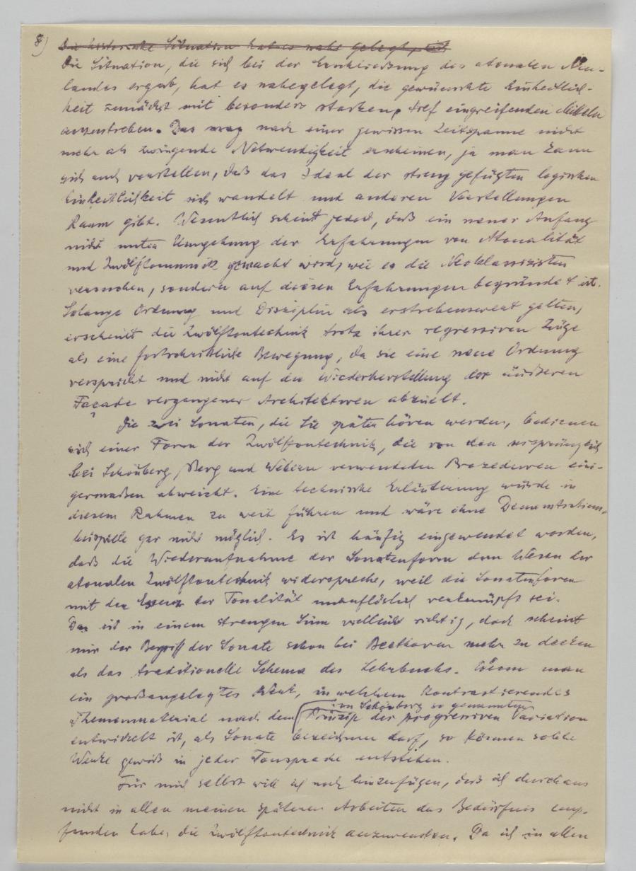 Die zwei Sonaten, die Sie später hören werden, bedienen sich einer Form der Zwölftontechnik, die von den ursprünglich bei Schönberg, Berg und Webern verwendeten Prozeduren eini- germaßen abweicht. Eine technische Erläuterung würde in diesem Rahmen zu weit führen und wäre ohne Demonstrations- beispiele gar nicht möglich. Es ist häufig eingewendet worden, daß die Wiederaufnahme der Sonatenform dem Wesen der atonalen Zwölftontechnik widerspreche, weil die Sonatenform mit der Essenz der Tonalität unauflöslich verknüpft sei. Das ist in einem strengen Sinn vielleicht richtig, doch scheint mir der Begriff der Sonate schon bei Beethoven mehr zu decken als das traditionelle Schema des Lehrbuchs. Wenn man ein großangelegtes Werk, in welchem kontrastierendes Themenmaterial nach dem von Schönberg so genannten Prinzip der progressiven Variation entwickelt ist, als Sonate bezeichnen darf, so können solche Werke gewiß in jeder Tonsprache entstehen.