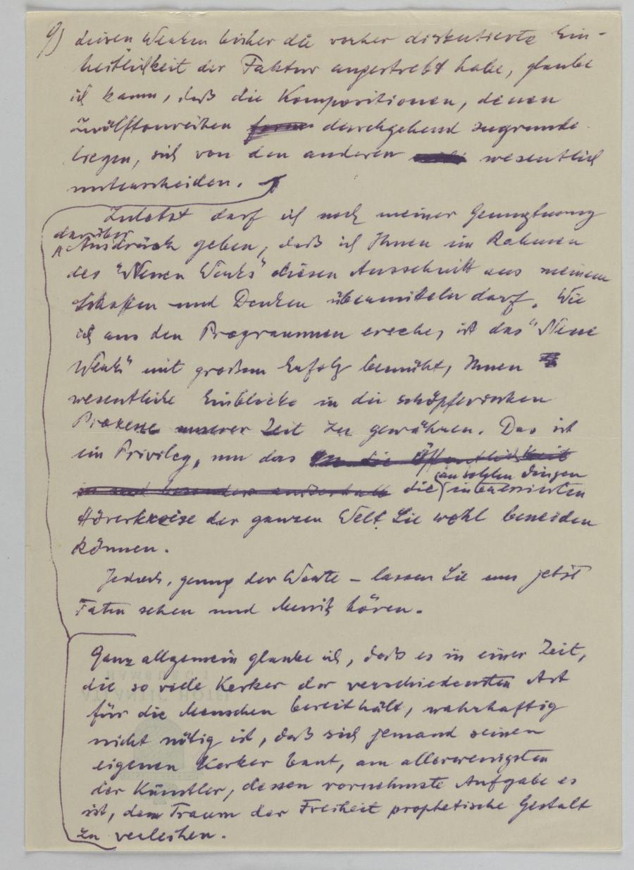 Zuletzt darf ich noch meiner Genugtung darüber Ausdruck geben, daß ich Ihnen im Rahmen des "Neuen Werks" diesen Ausschnitt aus meinem Schaffen und Denken übermitteln darf. Wie ich aus den Programmen ersehe, ist das "Neue Werk" mit großem Erfolg bemüht, Ihnen E wesentliche Einblicke in die schöpferischen Prozesse unserer Zeit zu gewähren. Das ist ein Privileg, um das die Öffentlichkeit in und besonders außerhalb die an solchen Dingen interessierten Hörerkreise der ganzen Welt Sie wohl beneiden können.