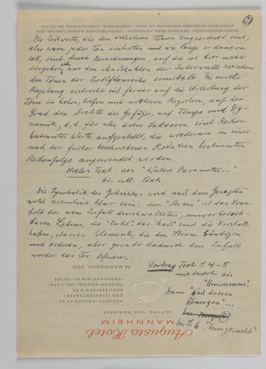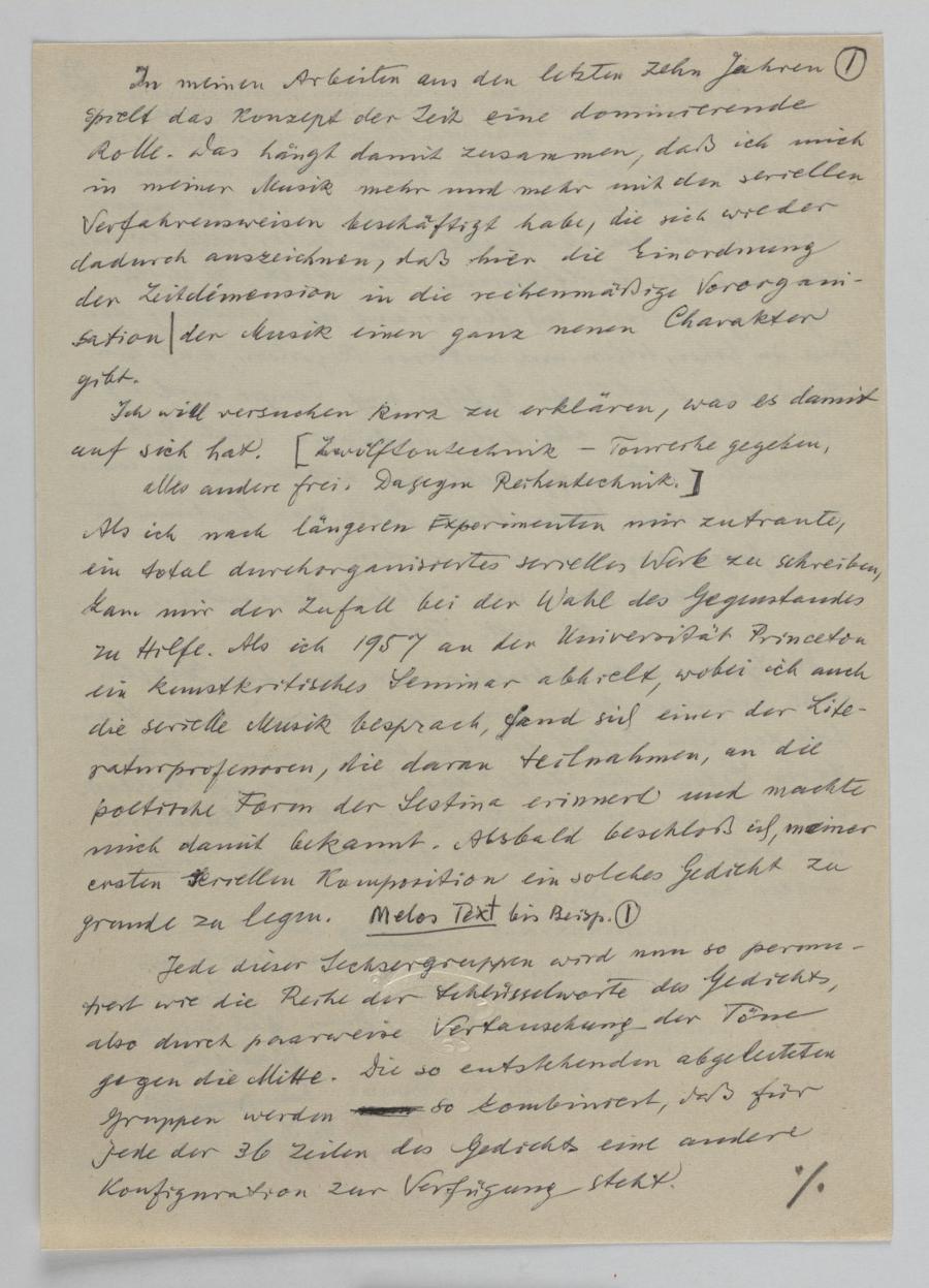 Die in diesem Dokument formulierten Textteile dienten offenbar als Notizen für einen nicht eindeutig identifizierbaren, ungefähr Mitte der 1960er Jahre gehaltenen Vortrag über serielle Verfahrensweisen. Anhand seiner eigenen Werke (Sestina, op. 161, die Opern „Ausgerechnet und verspielt“, op. 179 und „Der goldene Bock“, op. 186) erläutert er, wie inhaltliche Details der Texte mit musikalischen Verfahrensweisen korrespondieren.
