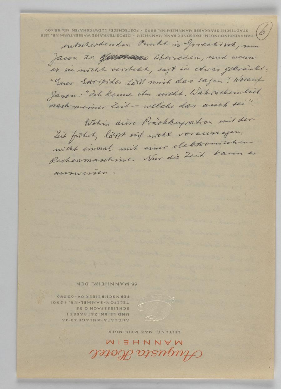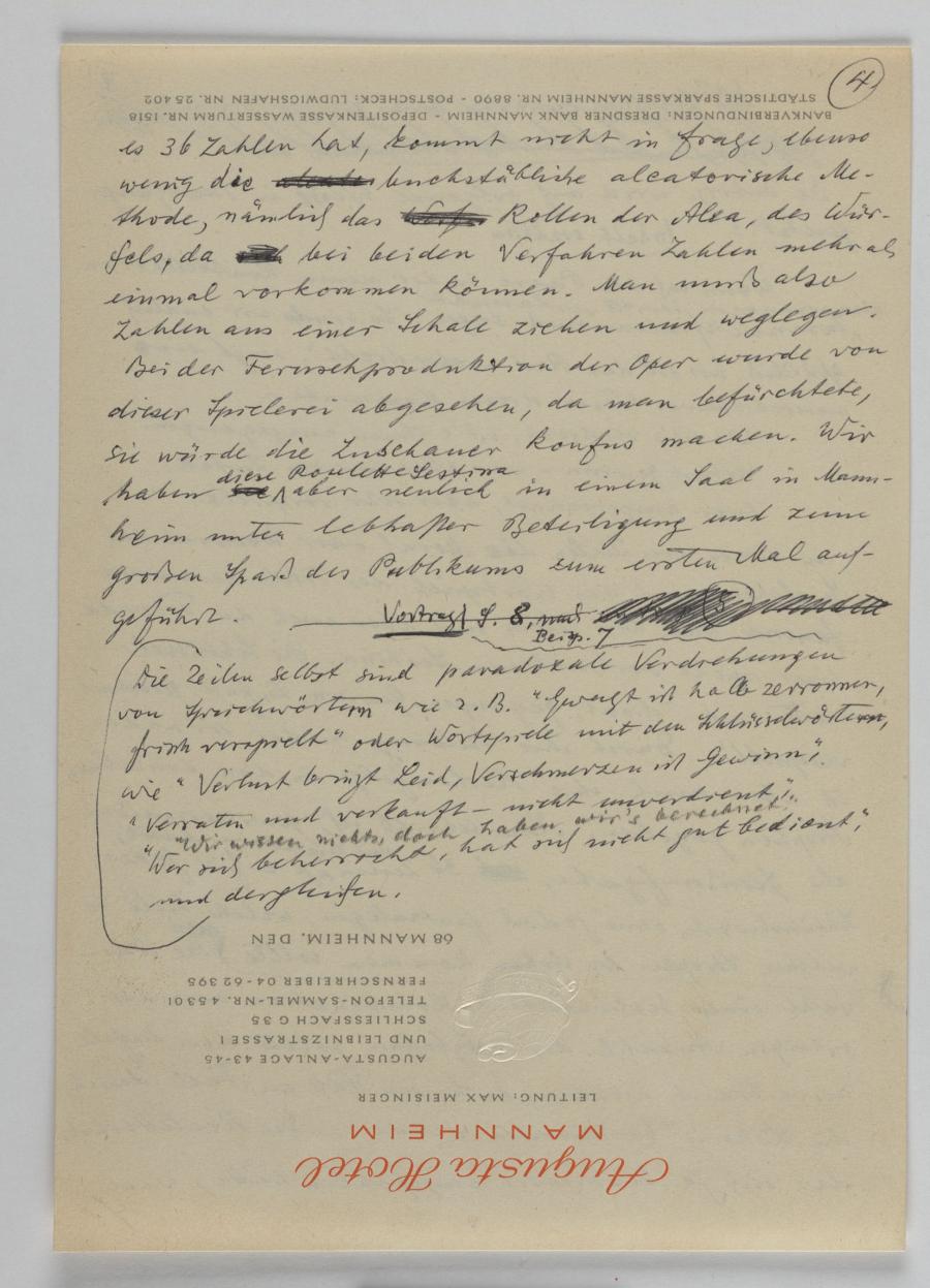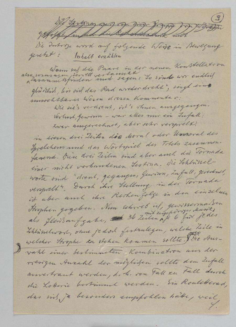 Verweise auf Passagen anderer Texte, die entsprechend in diesem Vortrag integriert werden sollten, bzw. den Vermerk „Inhalt erzählen“ am Beginn des Abschnitts über „Ausgerechnet und verspielt“ lassen vermuten, dass es sich bei diesem Dokument um eine Entwurfsfassung handelt.
