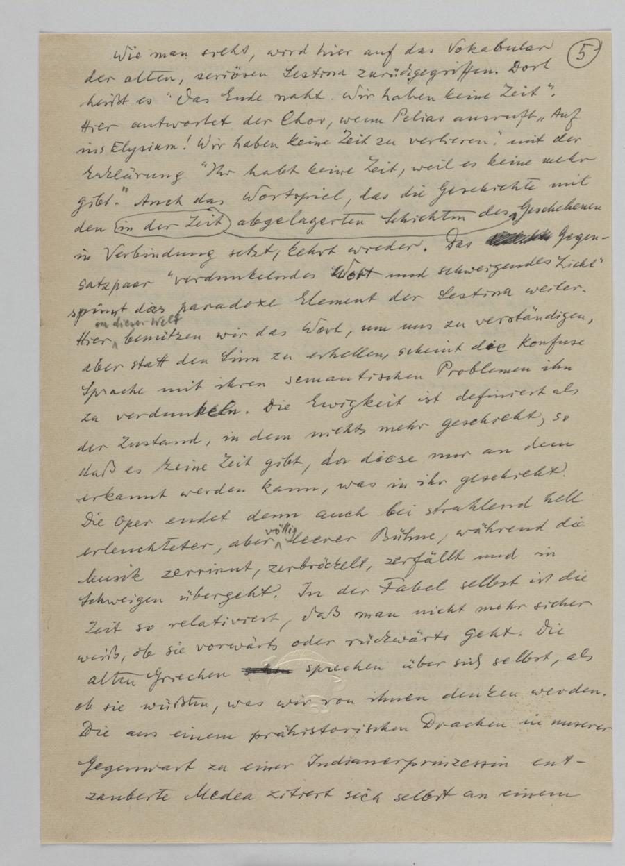 Wie man sieht wird hier auf das Vokabular der alten, seriösen Sestina zurückgegriffen. Dort heißt es "Das Ende naht. Wir haben keine Zeit". Hier antwortet der Chor, wenn Pelias ausruft "Auf ins Elysium! Wir haben keine Zeit zu verlieren," mit der Erklärung "Ihr habt keine Zeit, weil es keine mehr gibt." Auch das Wortspiel, das die Geschichte mit den abgelagerten Schichten des in der Zeit Geschehenen in Verbindung setzt, kehrt wieder. Das Gegen- satzpaar "verdunkelndes Wort und schweigendes Licht" spinnt das paradoxe Element der Sestina weiter. Hier in dieser Welt benützen wir das Wort, um uns zu verständigen, aber statt den Sinn zu erhellen, scheint die konfuse Sprache mit ihren semantischen Problemen ihn zu verdunkeln. Die Ewigkeit ist definiert als der Zustand, in dem nichts mehr geschieht, so daß es keine Zeit gibt, da diese nur an dem erkannt werden kann, was in ihr geschieht. Die Oper endet denn auch bei strahlend hell erleuchteter, aber völlig leerer Bühne, während die Musik zerrinnt, zerbröckelt, zerfällt und in Schweigen übergeht. In der Fabel selbst ist die Zeit so relativiert, daß man nicht mehr sicher weiß, ob sie vorwärts oder rückwärts geht. Die alten Griechen schrei sprechen über sich selbst, als ob sie wüßten, was wir von ihnen denken werden. Die aus einem prähistorischen Drachen in unserer Gegenwart zu einer Indianerprinzessin ent- zauberte Medea zitiert sich selbst an einem