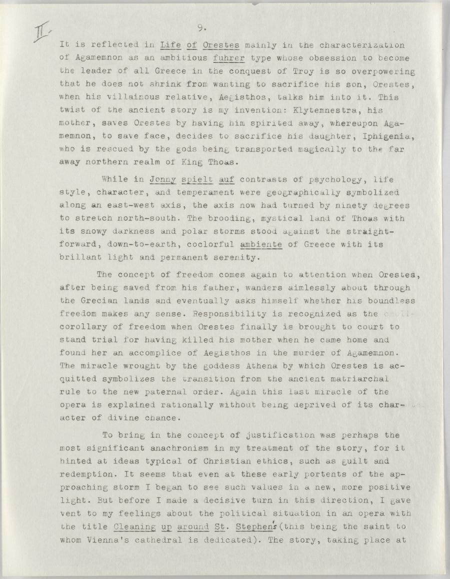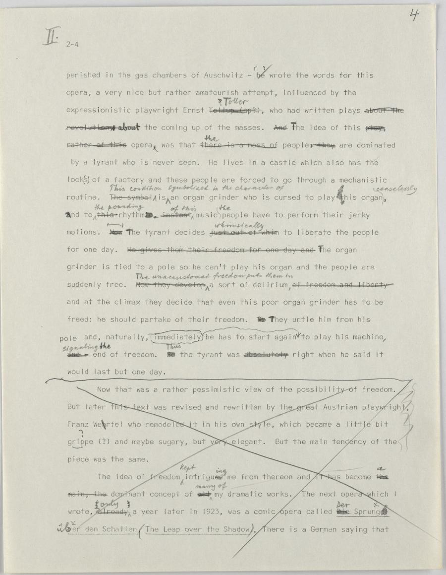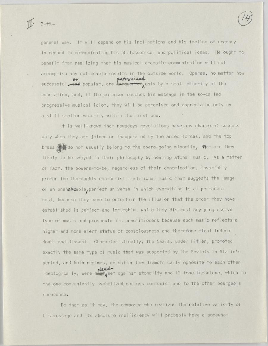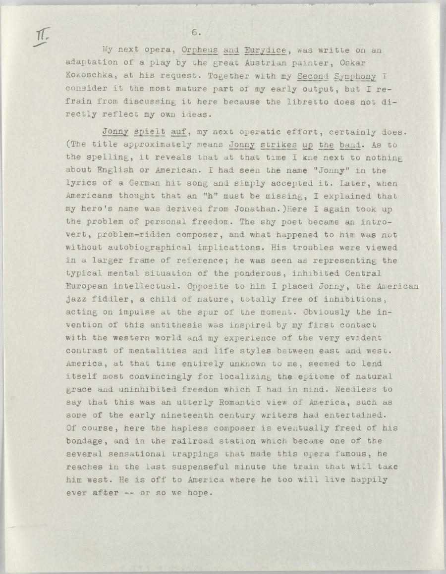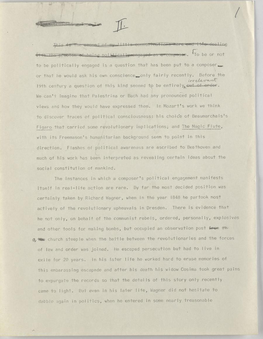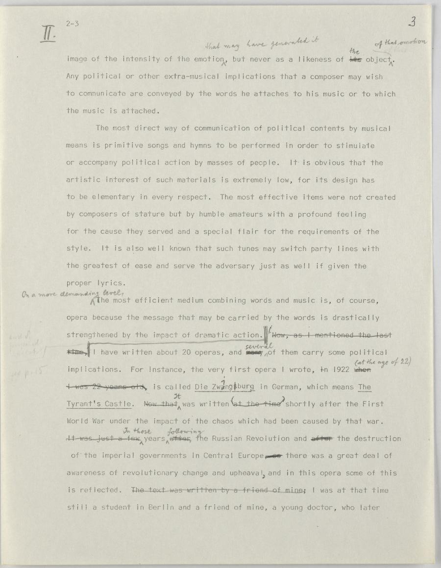 Kreneks zweiter Vortrag als Regent’s Lecturer an der UCSD, gehalten am 28. Jänner 1970. Ernst Krenek blickt auf sein eigenes Opernschaffen unter der Perspektive von politischem Engagement in jeweils unterschiedlichen politischen Kontexten, vom Zusammenbruch der westeuropäischen politischen Ordnung nach dem 1. Weltkrieg und der zeitgleichen russischen Revolution, über Faschismus und Nationalsozialismus, McCarthy-Ära bis zu post-kolonialistischen Aspekten.
