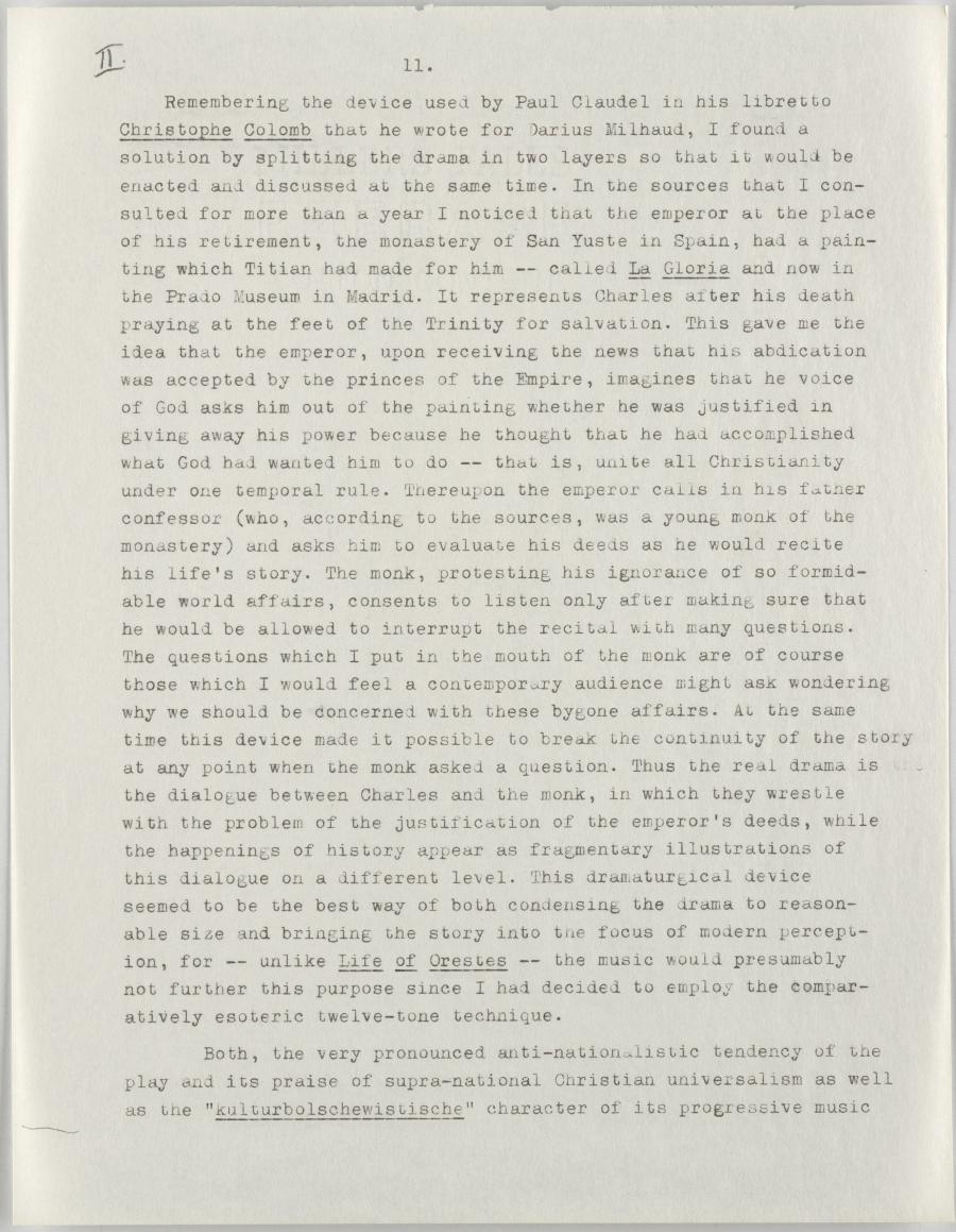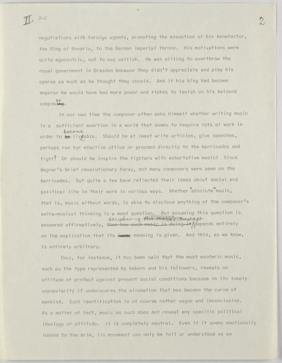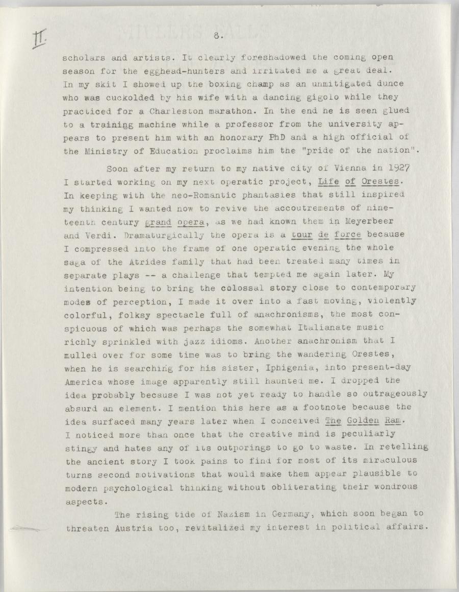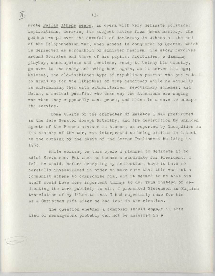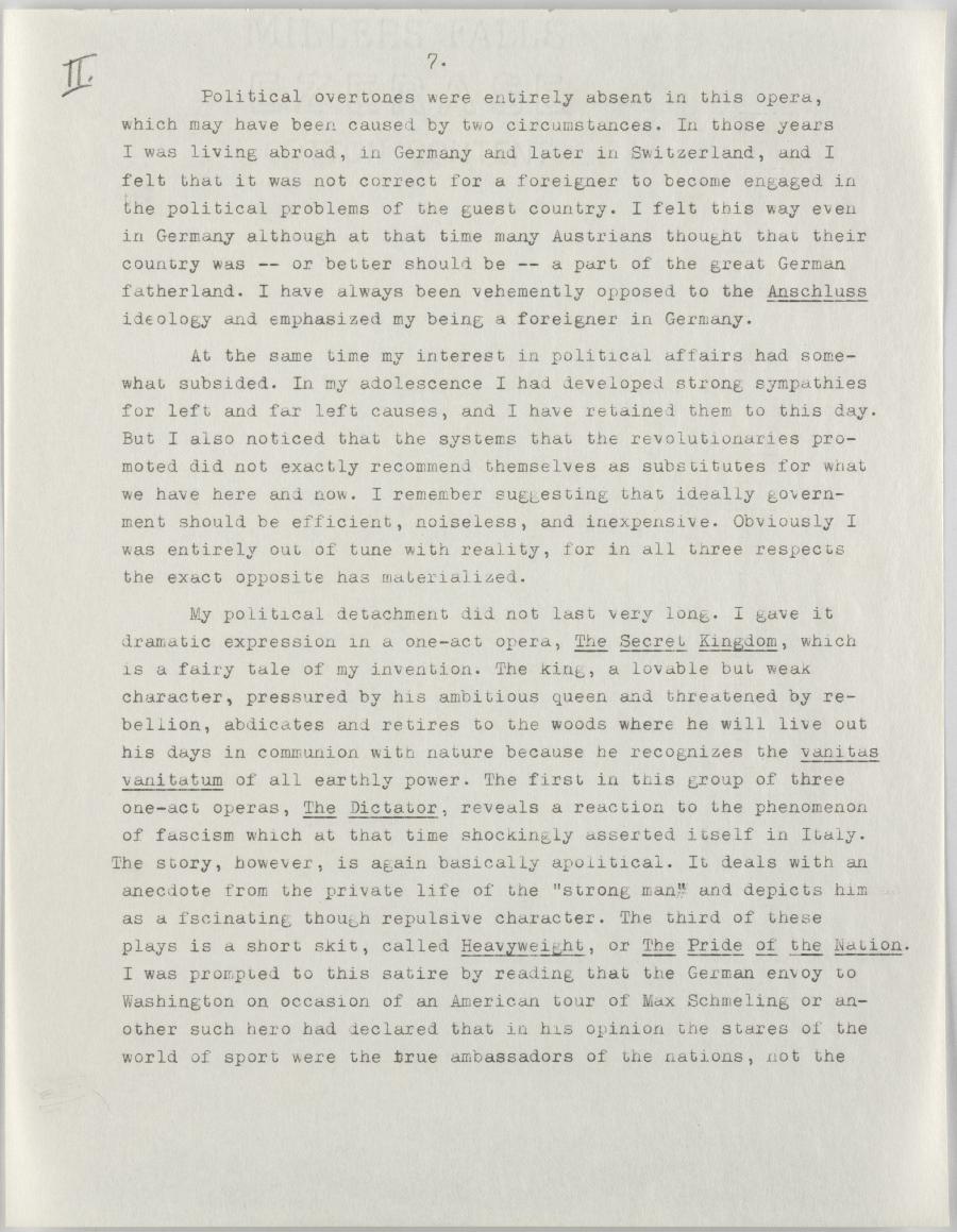 Kreneks zweiter Vortrag als Regent’s Lecturer an der UCSD, gehalten am 28. Jänner 1970. Ernst Krenek blickt auf sein eigenes Opernschaffen unter der Perspektive von politischem Engagement in jeweils unterschiedlichen politischen Kontexten, vom Zusammenbruch der westeuropäischen politischen Ordnung nach dem 1. Weltkrieg und der zeitgleichen russischen Revolution, über Faschismus und Nationalsozialismus, McCarthy-Ära bis zu post-kolonialistischen Aspekten.