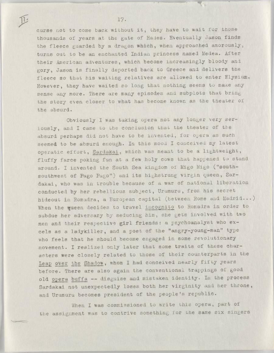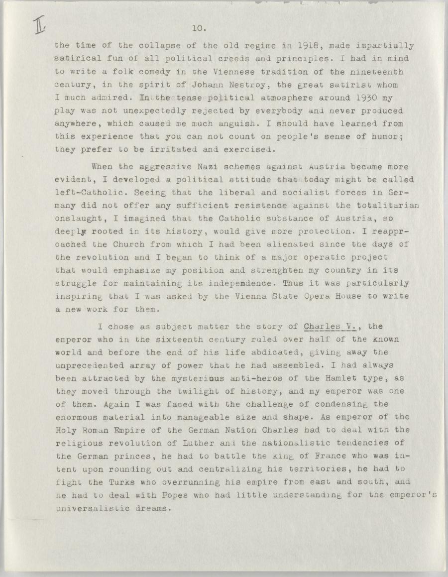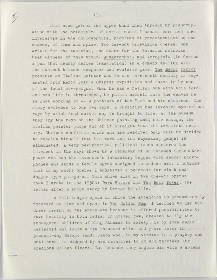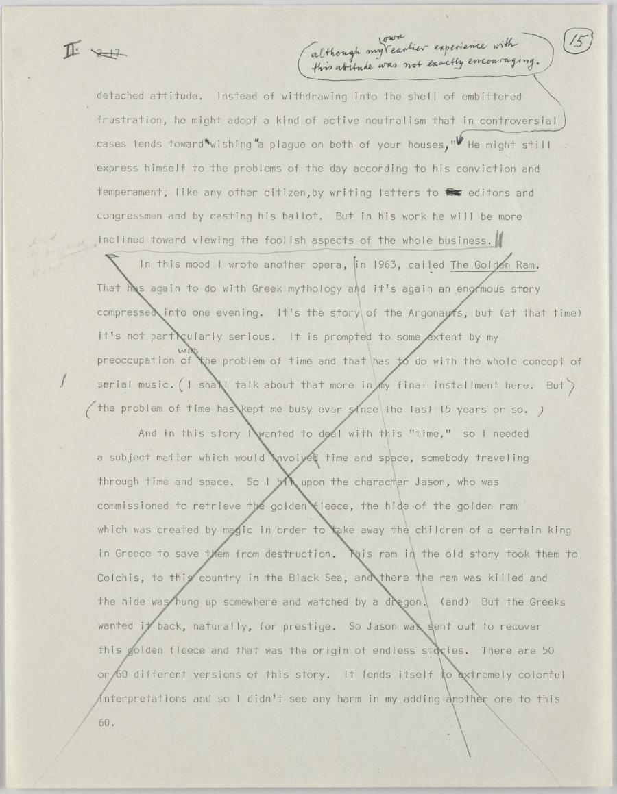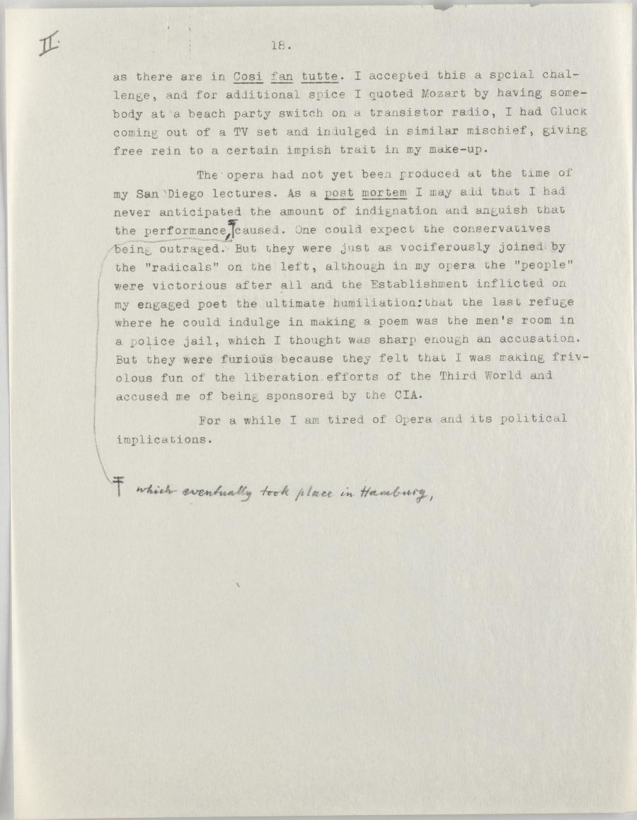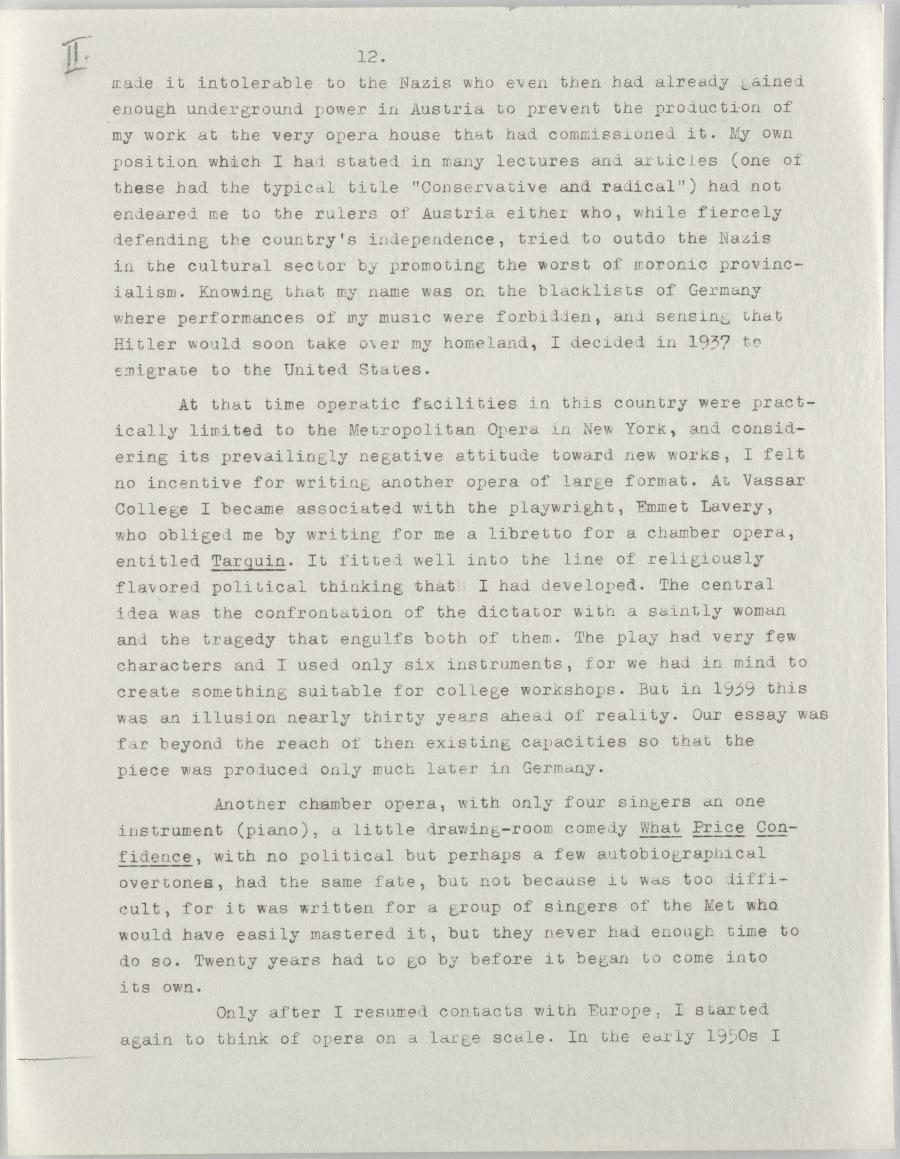 Kreneks zweiter Vortrag als Regent’s Lecturer an der UCSD, gehalten am 28. Jänner 1970. Ernst Krenek blickt auf sein eigenes Opernschaffen unter der Perspektive von politischem Engagement in jeweils unterschiedlichen politischen Kontexten, vom Zusammenbruch der westeuropäischen politischen Ordnung nach dem 1. Weltkrieg und der zeitgleichen russischen Revolution, über Faschismus und Nationalsozialismus, McCarthy-Ära bis zu post-kolonialistischen Aspekten.