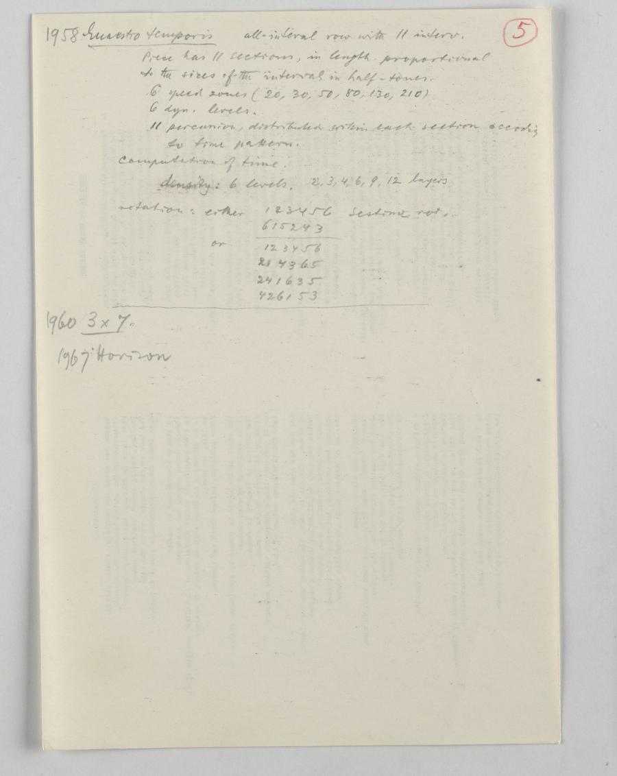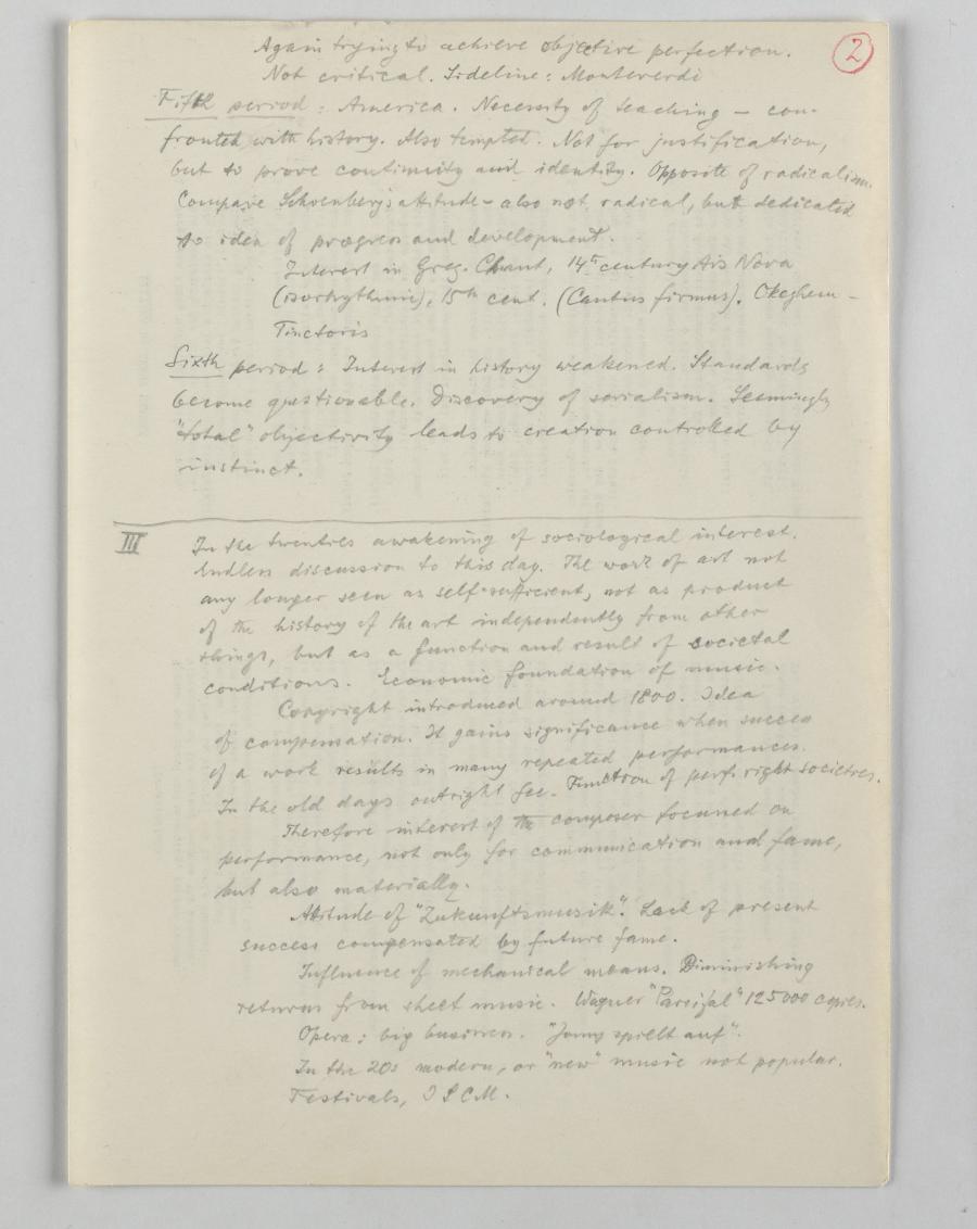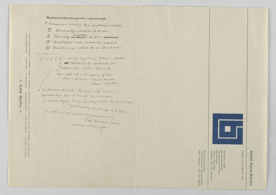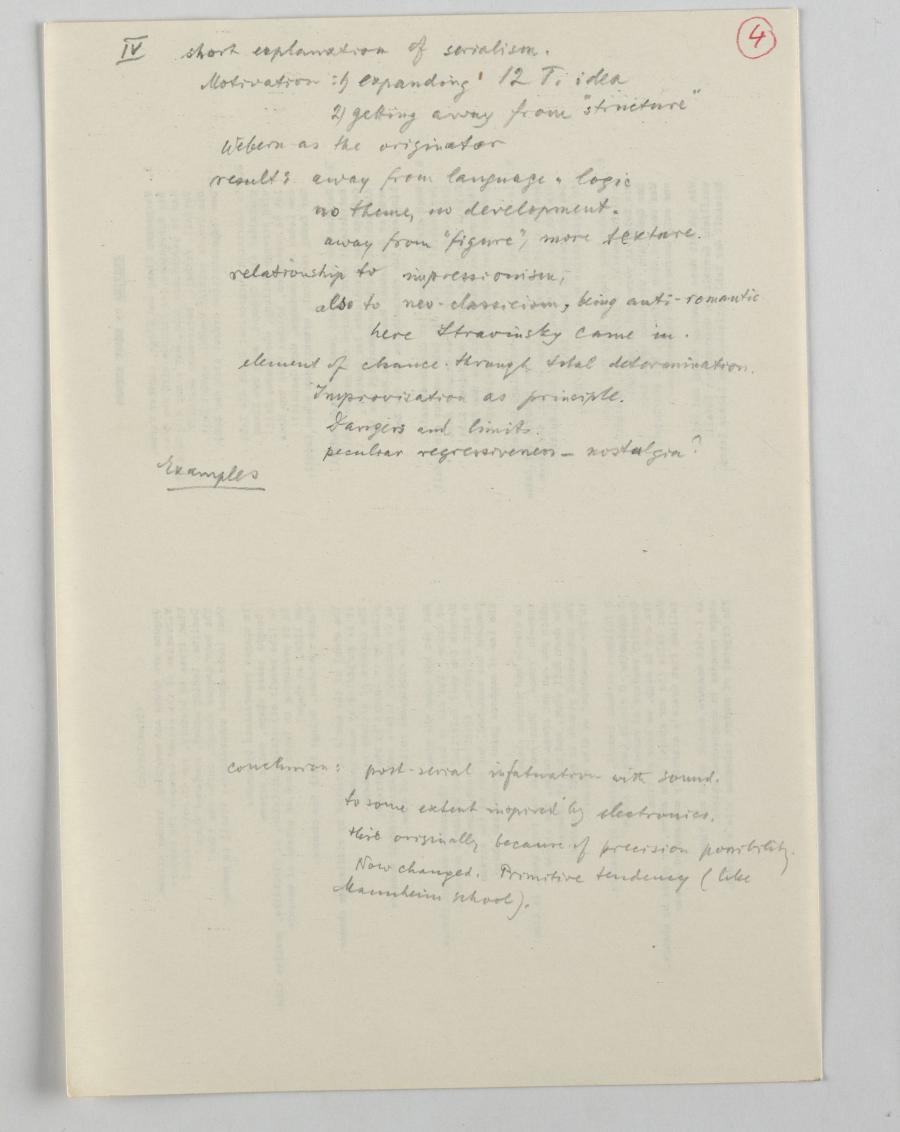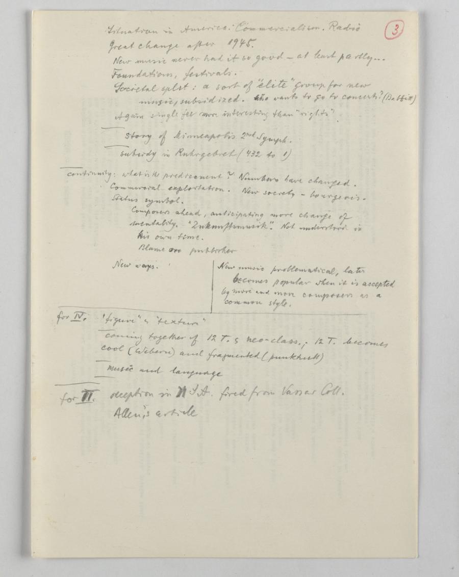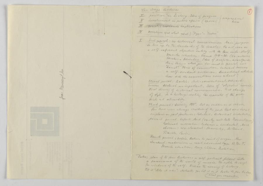In Vorbereitung für die Reihe von vier Vorträgen an der UCSD machte sich Krenek Notizen, die teilweise nur punktuell andeuten, was er in den einzelnen Lectures thematisieren wollte, aber trotzdem die gründliche Planung von den sich inhaltlich berührenden Vorträgen erkennbar machen.