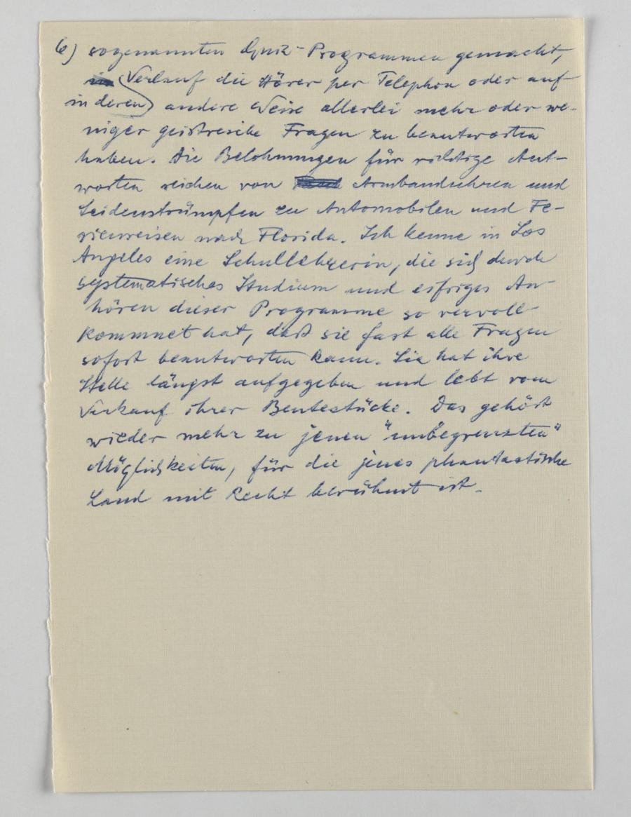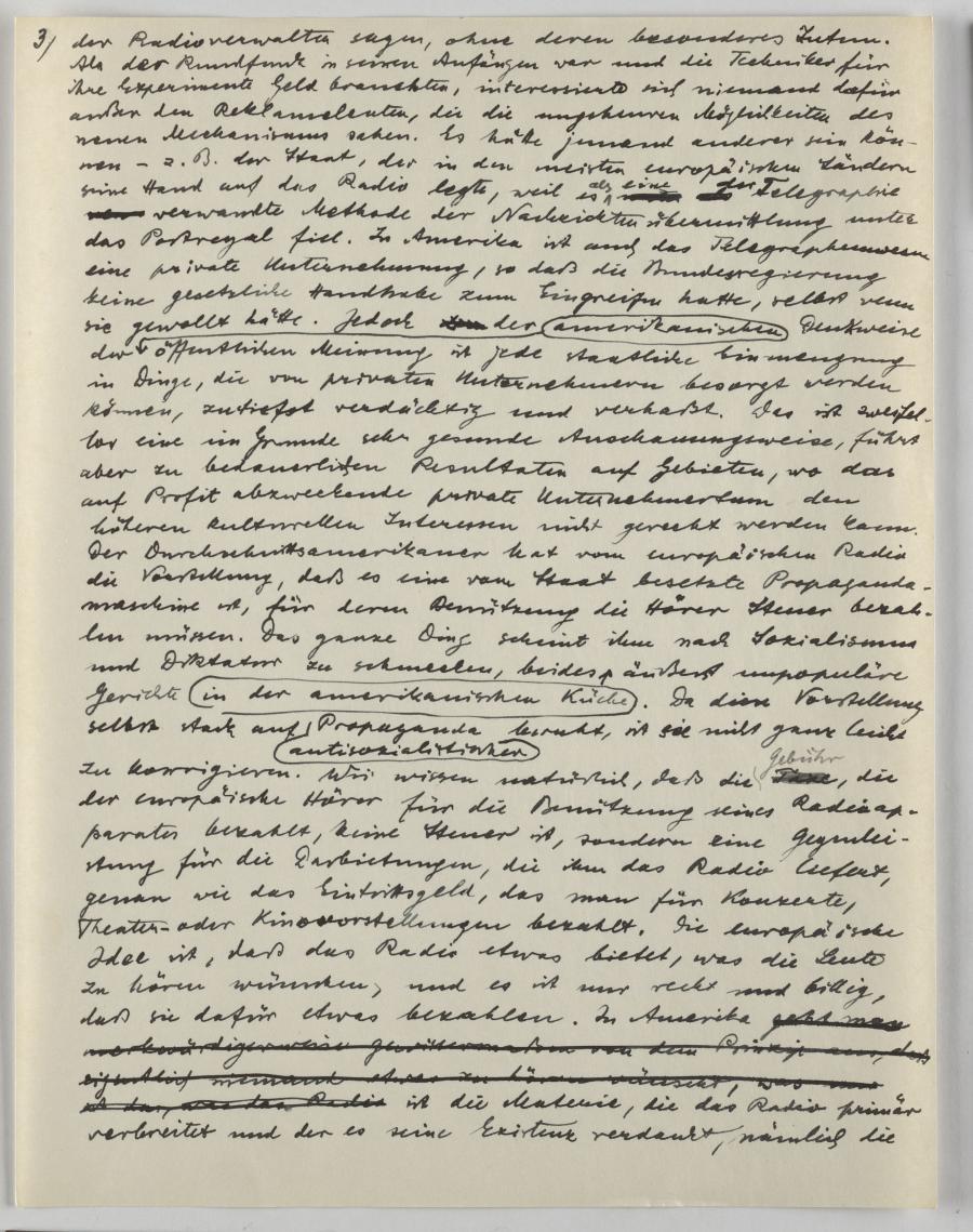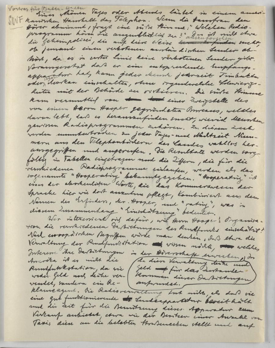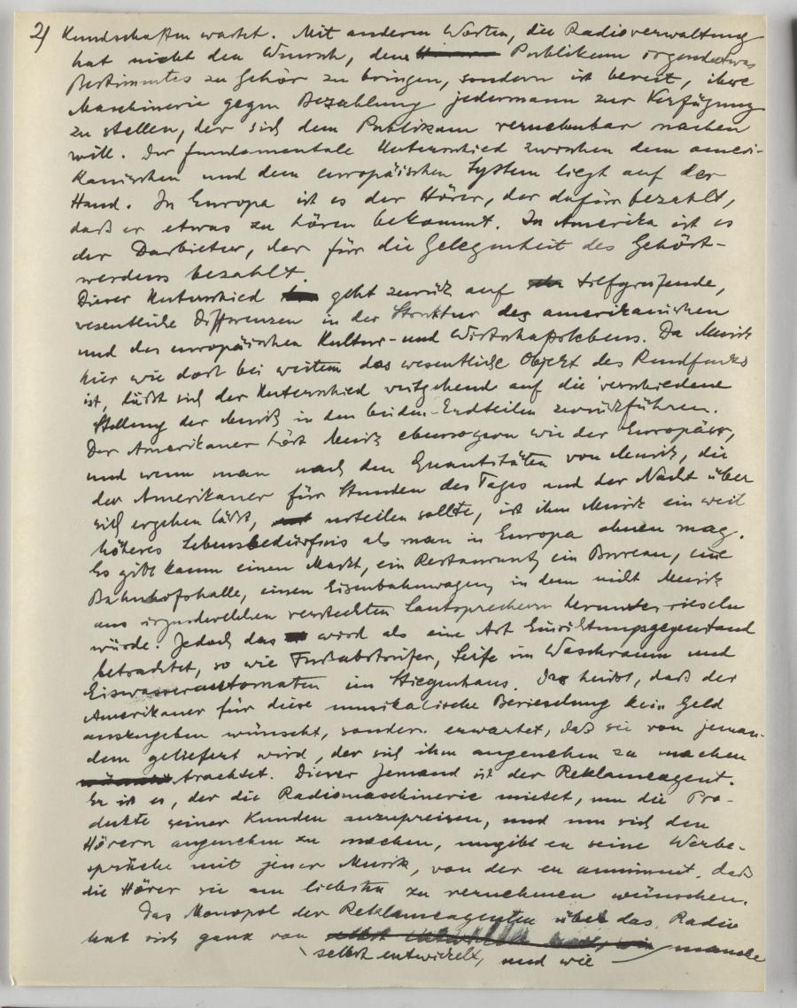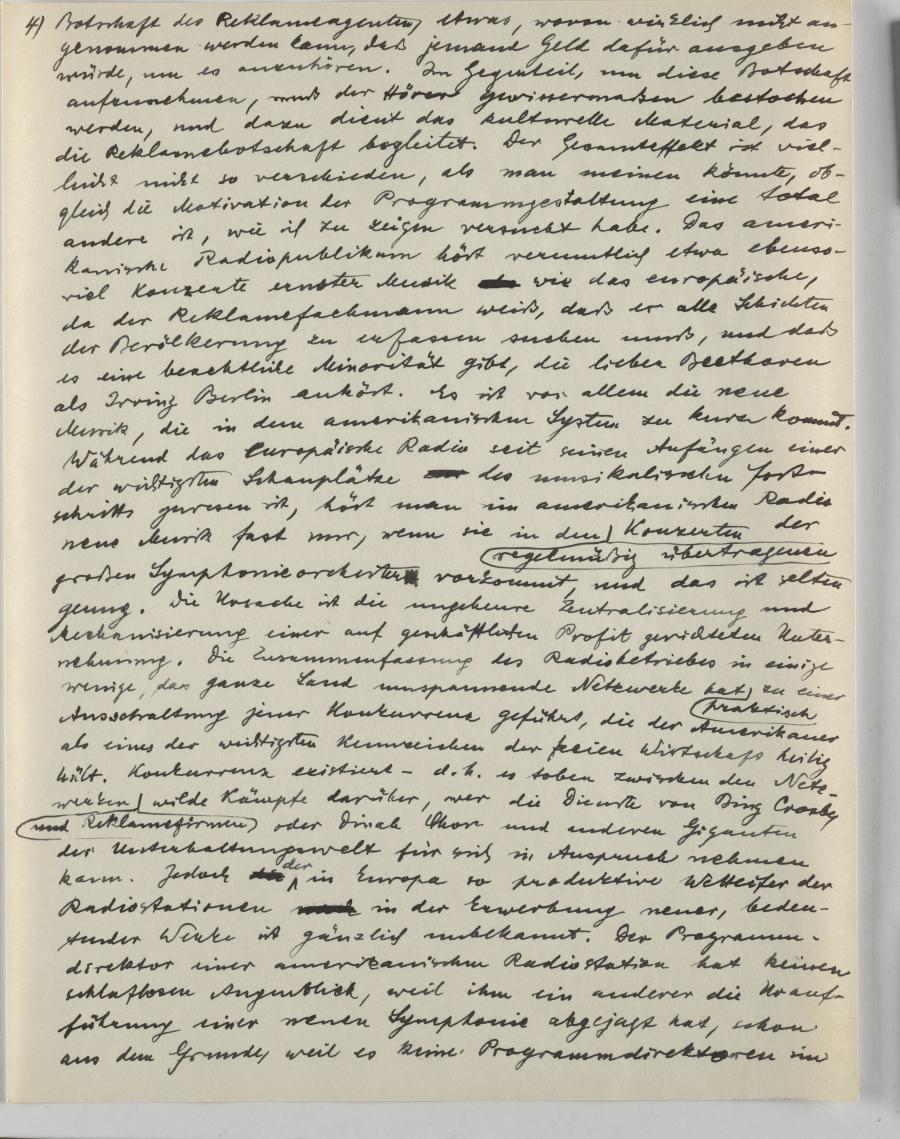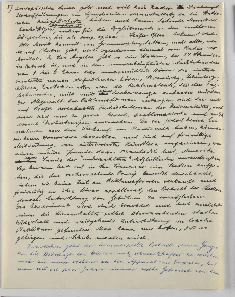Für den deutschen Radiosender Südwestfunk fasst Ernst Krenek (vermutlich zum 20-jährigen Bestehen des Senders) seine Beobachtungen zu den Differenzen zwischen deutschen und amerikanischer Radio-Kultur zusammen. Als zentrales, für diese Differenzen verantwortliches Element identifiziert Krenek dabei die Ausrichtung des amerikanischen Radiobetriebs entlang der kapitalistisch motivierten Reklameindustrie. Eine Folge davon ist die Verbannung der Übertragungen Neuer Musik von Strawinsky, Schönberg, Webern und Bartok in die „unverkäuflichen Nachstunden“ zwischen 1 und 6 Uhr. Als Versuch einer alternativen Betriebsform beschreibt Krenek den 1949 gegründeten, von Mitgliederbeiträgen und Freiwilligenarbeit getragenen kalifornischen Radiosender KPFA.