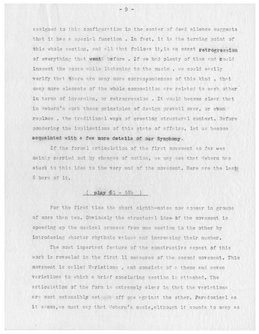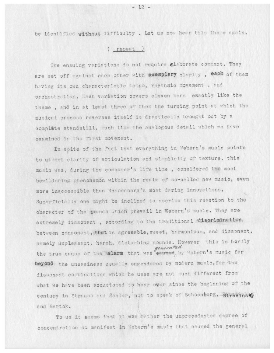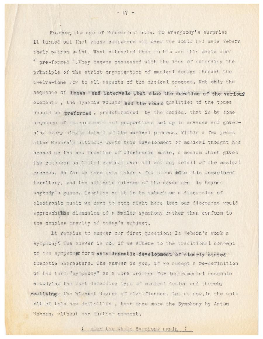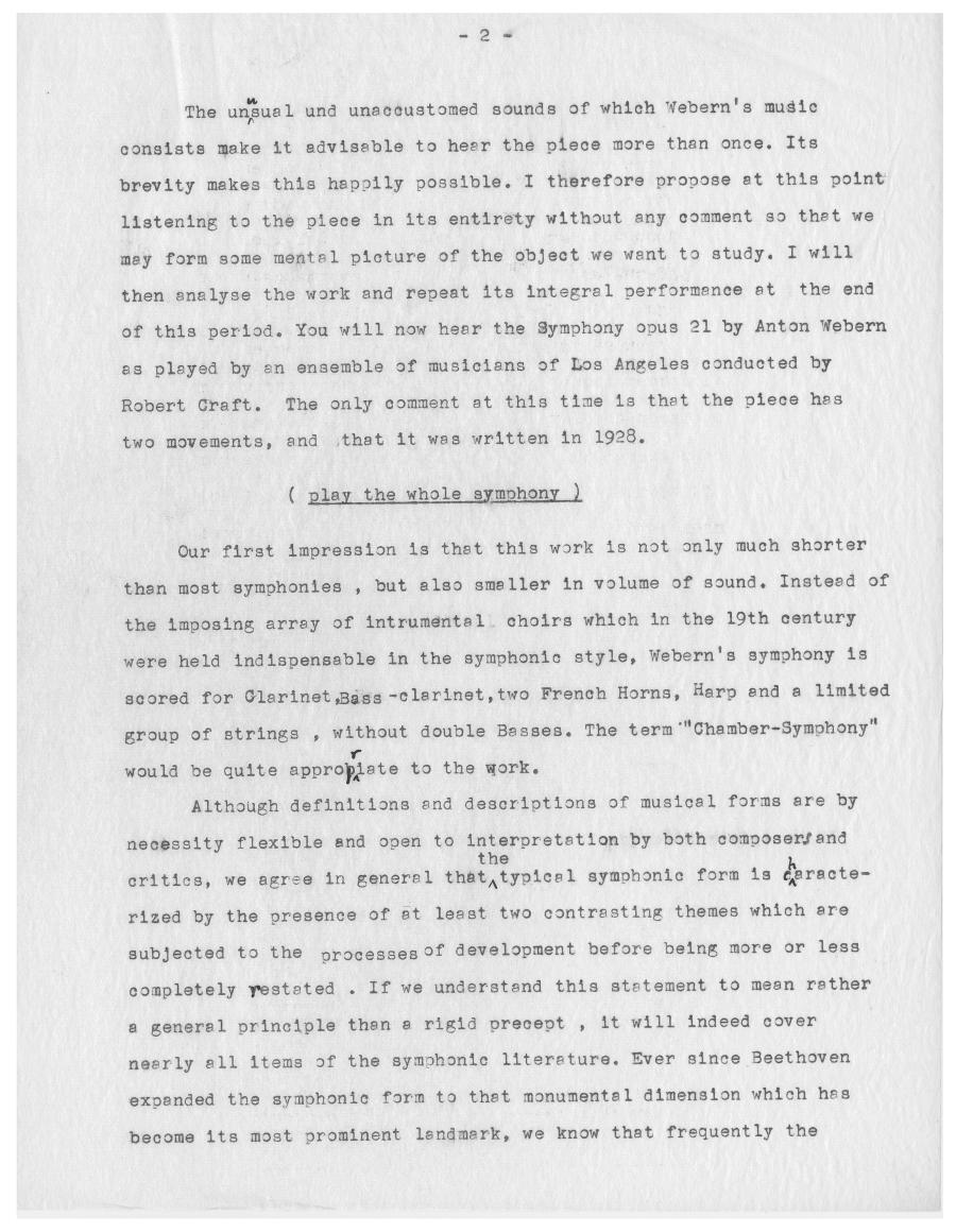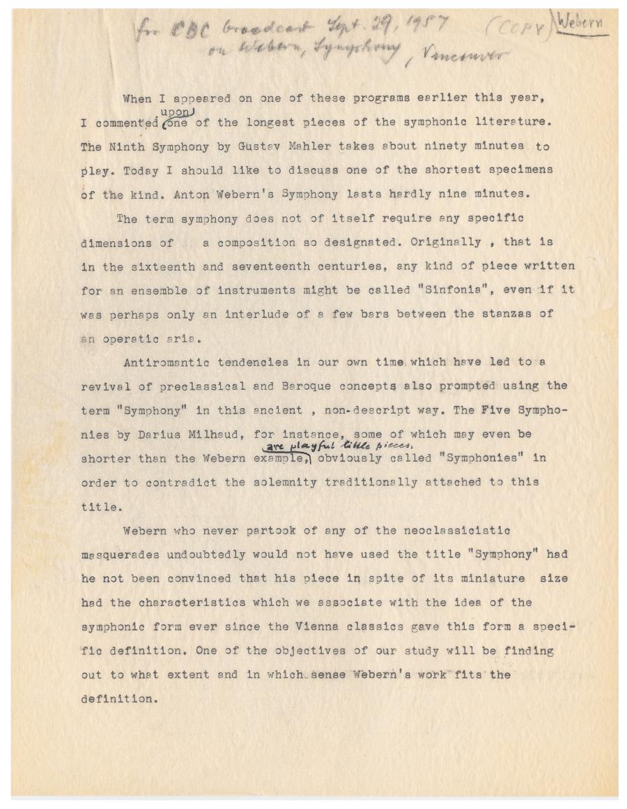 Für den kanadischen Radiosender CBC analysierte Ernst Krenek 1957 die Symphonie op. 21 von Anton Webern. Die Kürze des Werks erlaubt ihm dabei mehrere komplette Durchläufe sowie ein mehrfaches Wiederholen einzelner Passagen um den Zuhörenden auch kleinste Details an Weberns Komposition zugänglich zu machen. Am Ende der Radiosendung demonstriert Krenek, dass die verdichtete Kürze von Weberns Musik keine technische Konsequenz aus der Anwendung der Zwölftontechnik ist, sondern vielmehr eine Fortsetzung von Weberns auf Intensivierung emotionalen Ausdrucks abzielender expressionistischer Schaffensphase ist. Außerdem verortete Krenek die Symphonie Weberns als Schlüsselwerk in der Weiterentwicklung der Zwölftontechnik zum Serialismus.