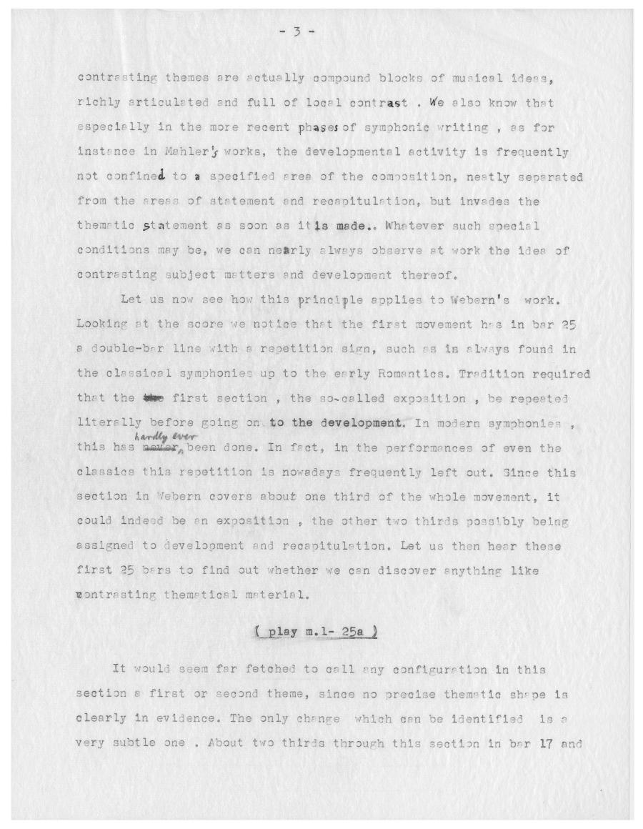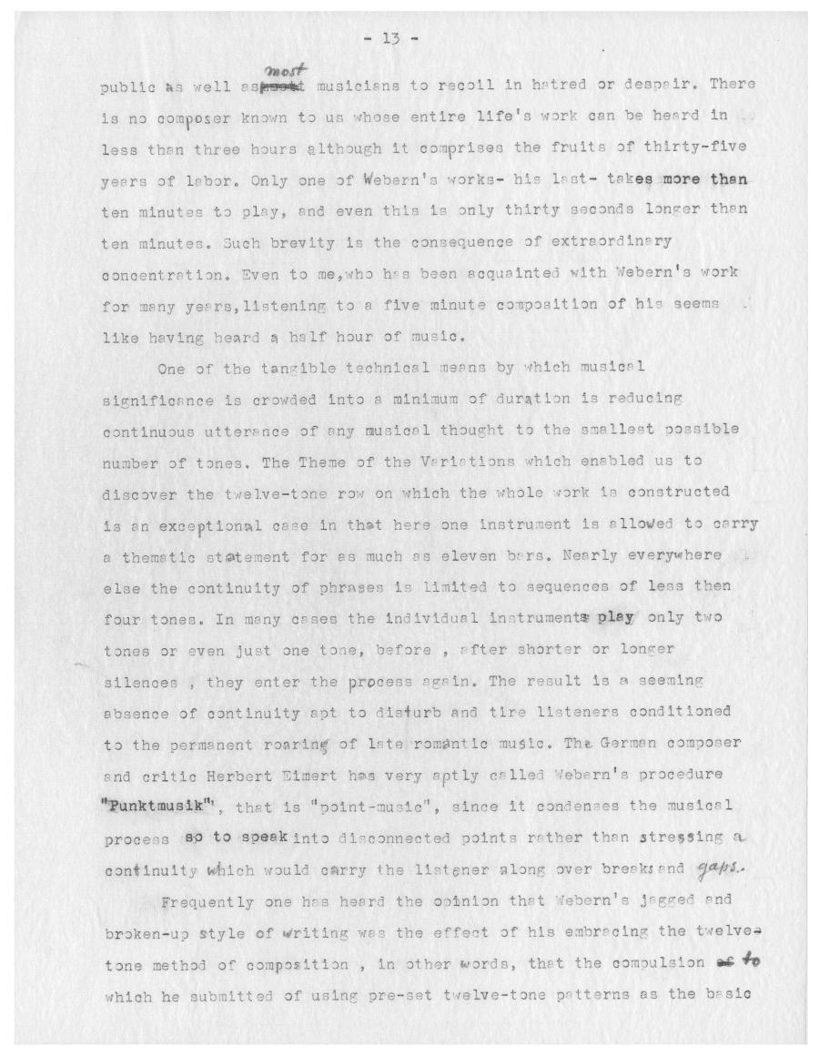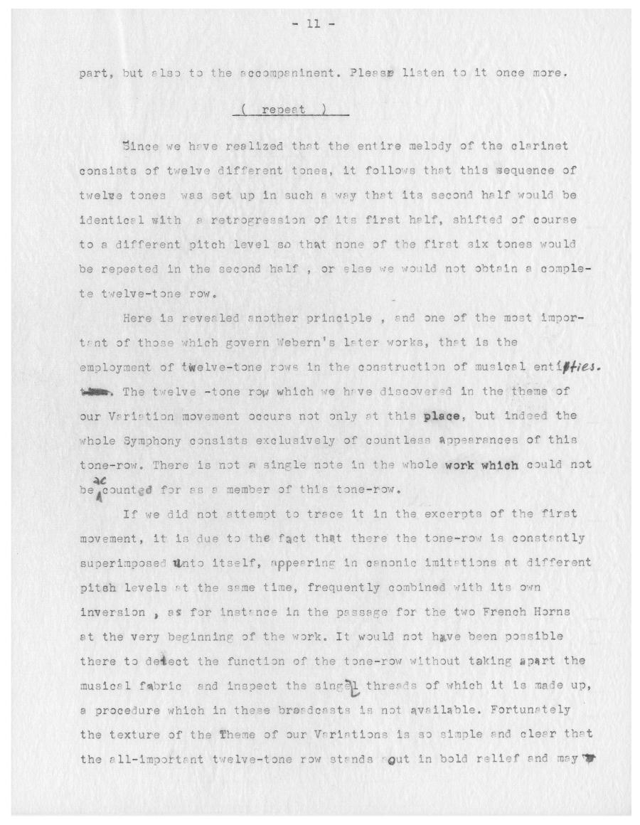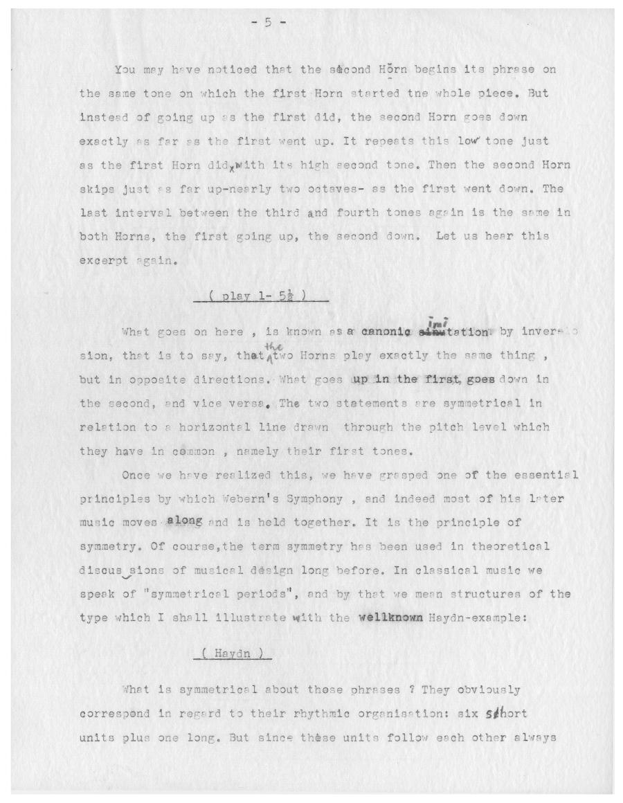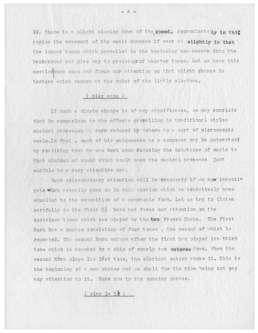 Für den kanadischen Radiosender CBC analysierte Ernst Krenek 1957 die Symphonie op. 21 von Anton Webern. Die Kürze des Werks erlaubt ihm dabei mehrere komplette Durchläufe sowie ein mehrfaches Wiederholen einzelner Passagen um den Zuhörenden auch kleinste Details an Weberns Komposition zugänglich zu machen. Am Ende der Radiosendung demonstriert Krenek, dass die verdichtete Kürze von Weberns Musik keine technische Konsequenz aus der Anwendung der Zwölftontechnik ist, sondern vielmehr eine Fortsetzung von Weberns auf Intensivierung emotionalen Ausdrucks abzielender expressionistischer Schaffensphase ist. Außerdem verortete Krenek die Symphonie Weberns als Schlüsselwerk in der Weiterentwicklung der Zwölftontechnik zum Serialismus.