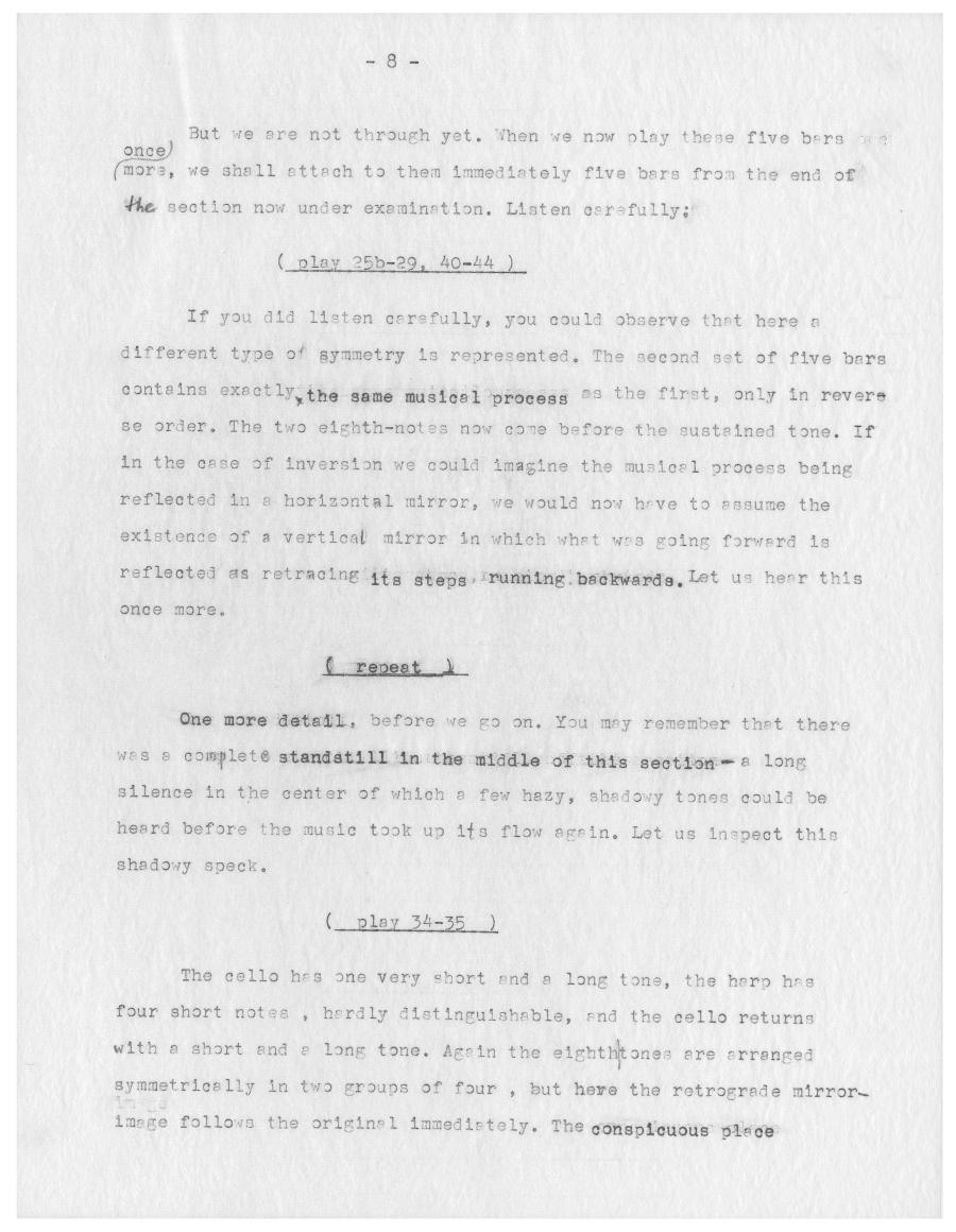 Since we have realized that the entire melody of the clarinet consists of twelve different tones, it follows that this sequence of twelve tones was set up in such a way that its second half would be identical with a retrogression of its first half, shifted of course to a different pitch level so that none of the first six tones would be repeated in the second half, or else we would not obtain a comple- te twelve-tone row.