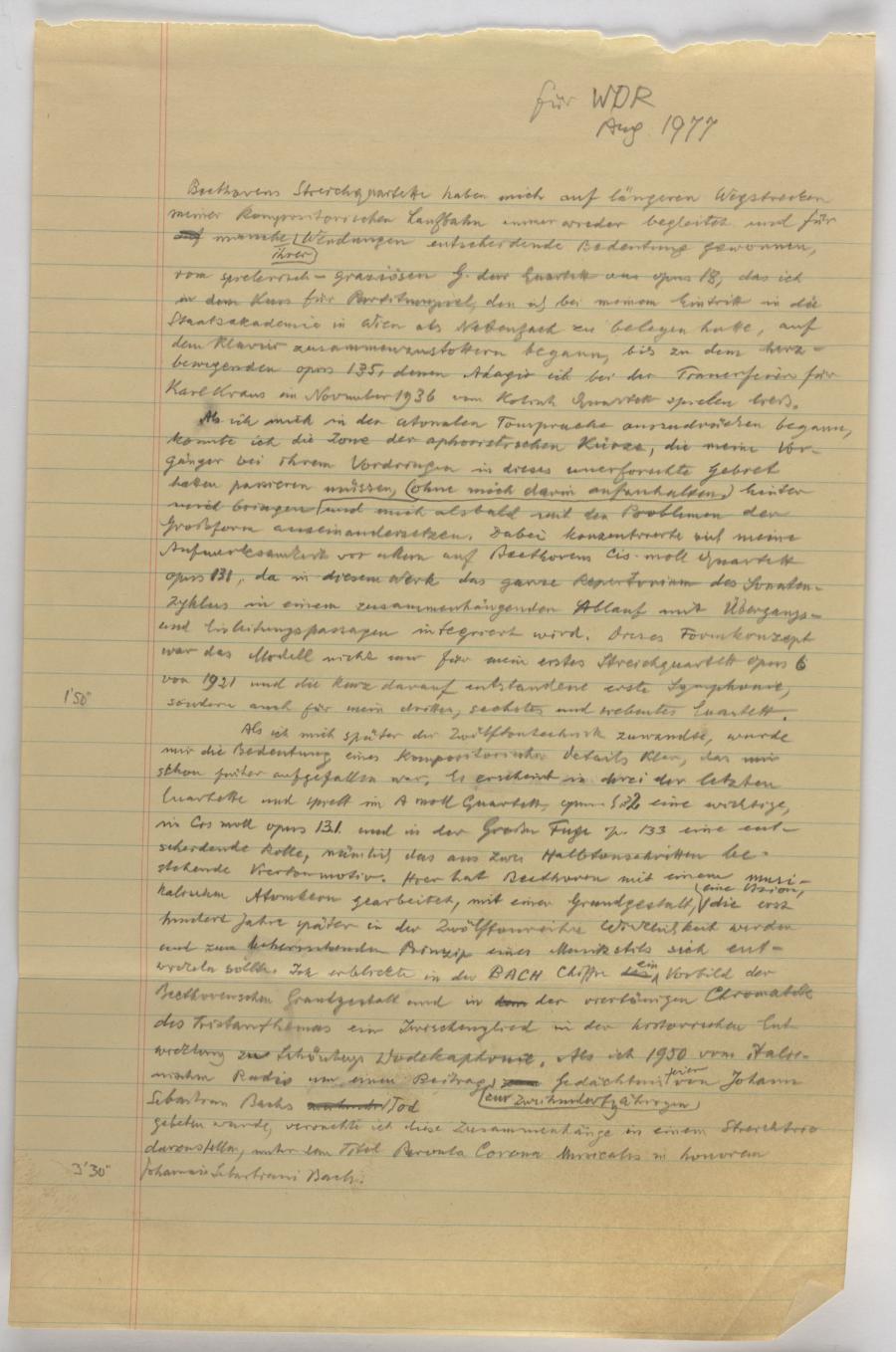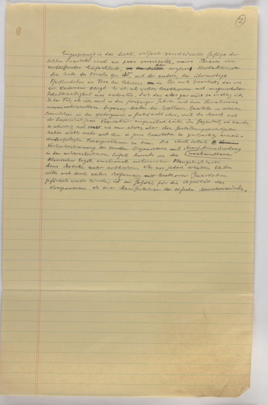 Beethovens Streichquartette haben mich auf längeren Wegstrecken meiner kompositorischen Laufbahn immer wieder begleitet und für auf manche ihrer Wendungen entscheidende Bedeutung gewonnen, vom spielerisch - graziösen G-dur Quartett aus opus 18, das ich in dem Kurs für Partiturspiel, den ich bei meinem Eintritt in die Staatsakademie in Wien als Nebenfach zu belegen hatte, auf dem Klavier zusammenzustottern begann bis zu dem herz- bewegenden opus 135, dessen Adagio ich bei der Trauerfeier für Karl Kraus im November 1936 vom Kolisch Quartett spielen ließ.
