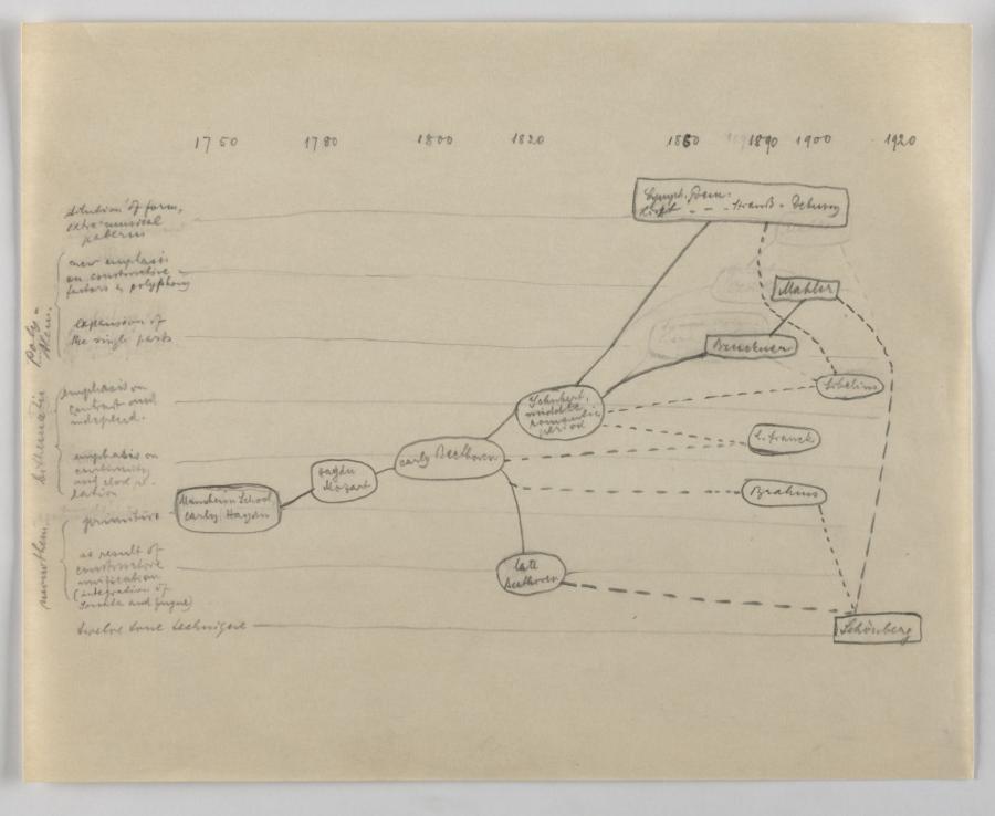 Tabellarische Übersicht über Komponisten und Entwicklung prägnanter Stilmerkmale der Musik nach Bach, ausgehend von Mannheimer Schule, frühen Haydn und Mozart, über Schubert Brahms, den Symphonischen Gedichten Franz Liszts, und Richard Strauss, bis zu Mahler und Schönberg. Verbindungslinien skizzieren dabei einen evolutionären Verlauf dieser Entwicklungen. Signifikant ist hier sicher seine auch in anderen Texten beschriebene Einschätzung einer Entwicklung vom Spätwerk Beethovens zu Arnold Schönberg.