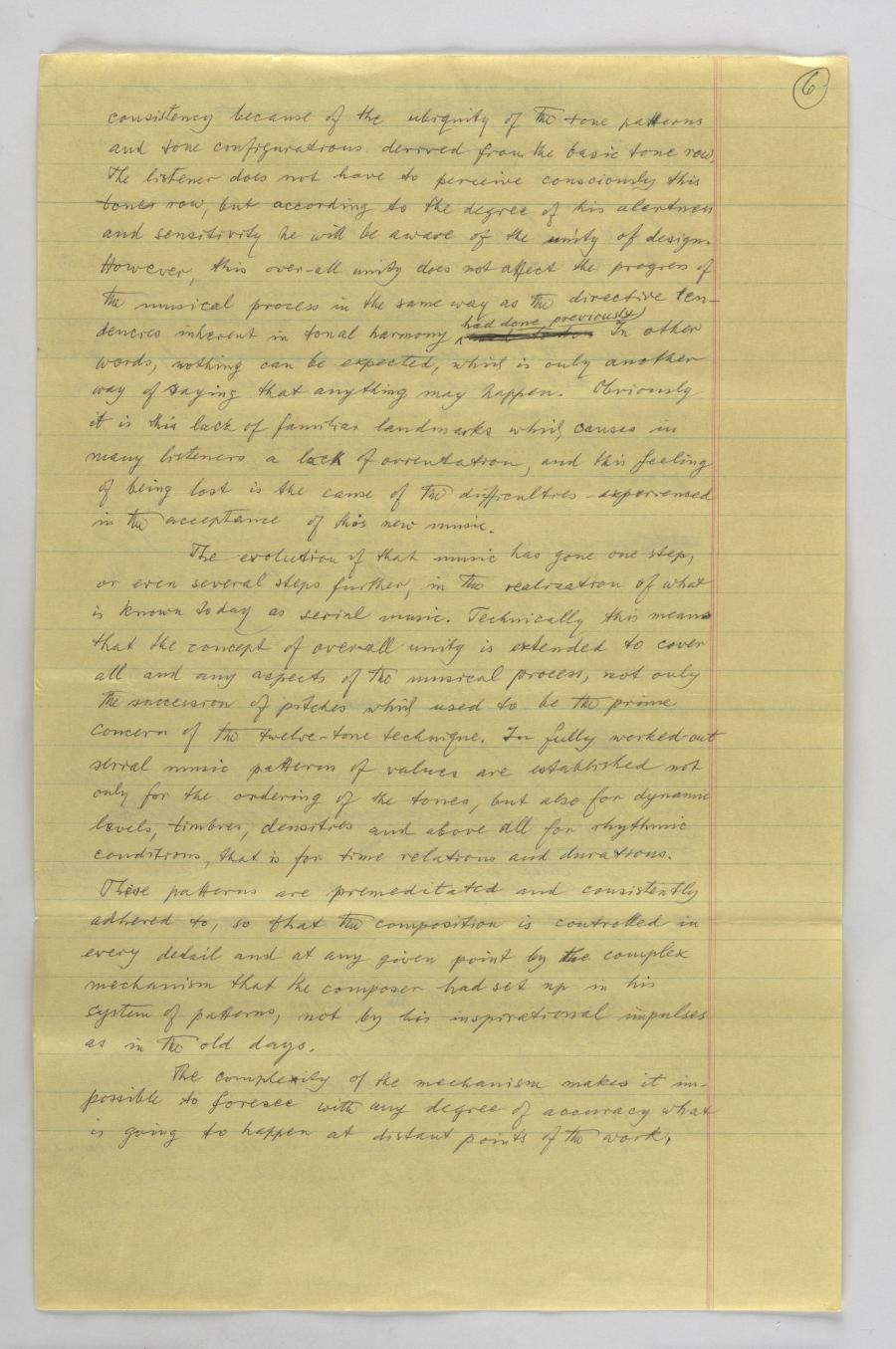 The evolution of that music has gone one step, or even several steps further, in the realization of what is known today as serial music. Technically this means that the concept of overall unity is extended to cover all and any aspects of the musical process, not only the succession of pitches which used to be the prime concern of the twelve-tone technique. In fully worked-out serial music patterns of values are established not only for the ordering of the tones, but also for dynamic levels, timbres, densities and above all for rhythmic conditions, that is for time relations and durations. These patterns are premeditated and consistently adhered to, so that the composition is controlled in every detail and at any given point by the complex mechanism that the composer had set up in his system of patterns, not by his inspirational impulses as in the old days.