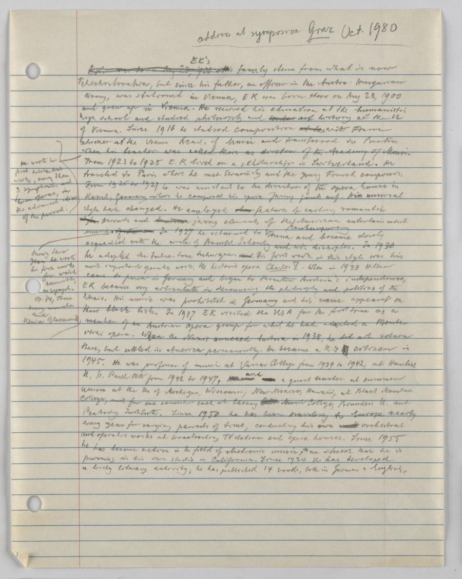 Eine sehr knapp gehaltene, autobiographische Darstellung seines Lebens mit Betonung seiner kompositorischen Entwicklung, die er beispielhaft an jeweils zentralen Werken festmacht. Überschrieben ist sie mit „address at symposium Graz Oct. 1980“, wobei kaum vorstellbar ist, dass dies tatsächlich als Ansprache für diese Gelegenheit gedacht war. Dagegen spricht sowohl die Verwendung der englischen Sprache als auch die Perspektive der dritten Person. Möglicherweise war es ein Entwurf für eine Kurzbiographie in einem Programmheft von einer der vielen Veranstaltungen aus Anlass von Kreneks 80. Geburtstag.