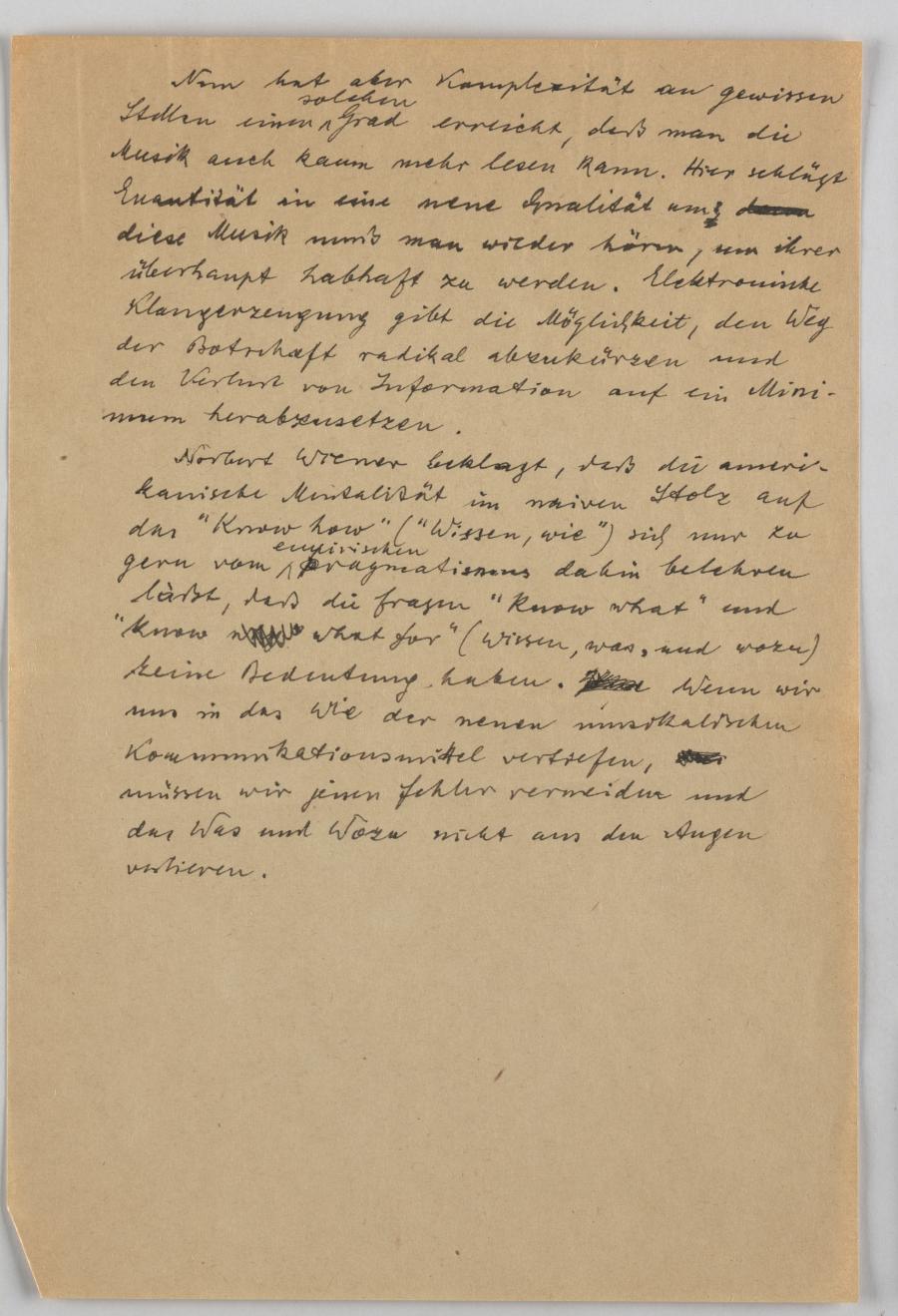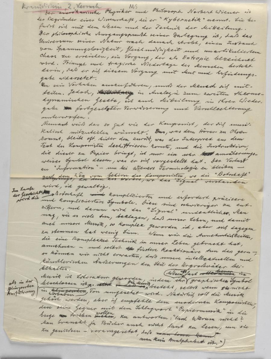 Mit Bezug auf Theorien zur Kybernetik von Norbert Wiener diskutiert Krenek in dem kurzen Einleitungsvortrag zu einer Veranstaltung im Rahmen der Darmstädter Ferienkurse (vermutlich 1956) die Beziehung zwischen durch Symbole notierte Musik und deren klingender Ausführung im Zusammenhang mit der immer komplexer werdenden Neueren Musik. In der elektronische Klangerzeugung sieht er eine Möglichkeit Kommunikationswege zwischen Komponist:innen und Interpret:innen abzukürzen und so Informationsverlust zu vermeiden. In einem Gedankenspiel zieht er eine Parallele von Musik und Literatur indem Musik auch geschaffen werden könnte, um nur in ihrem in Symbolen fixierten Ausdruck konsumiert zu werden.