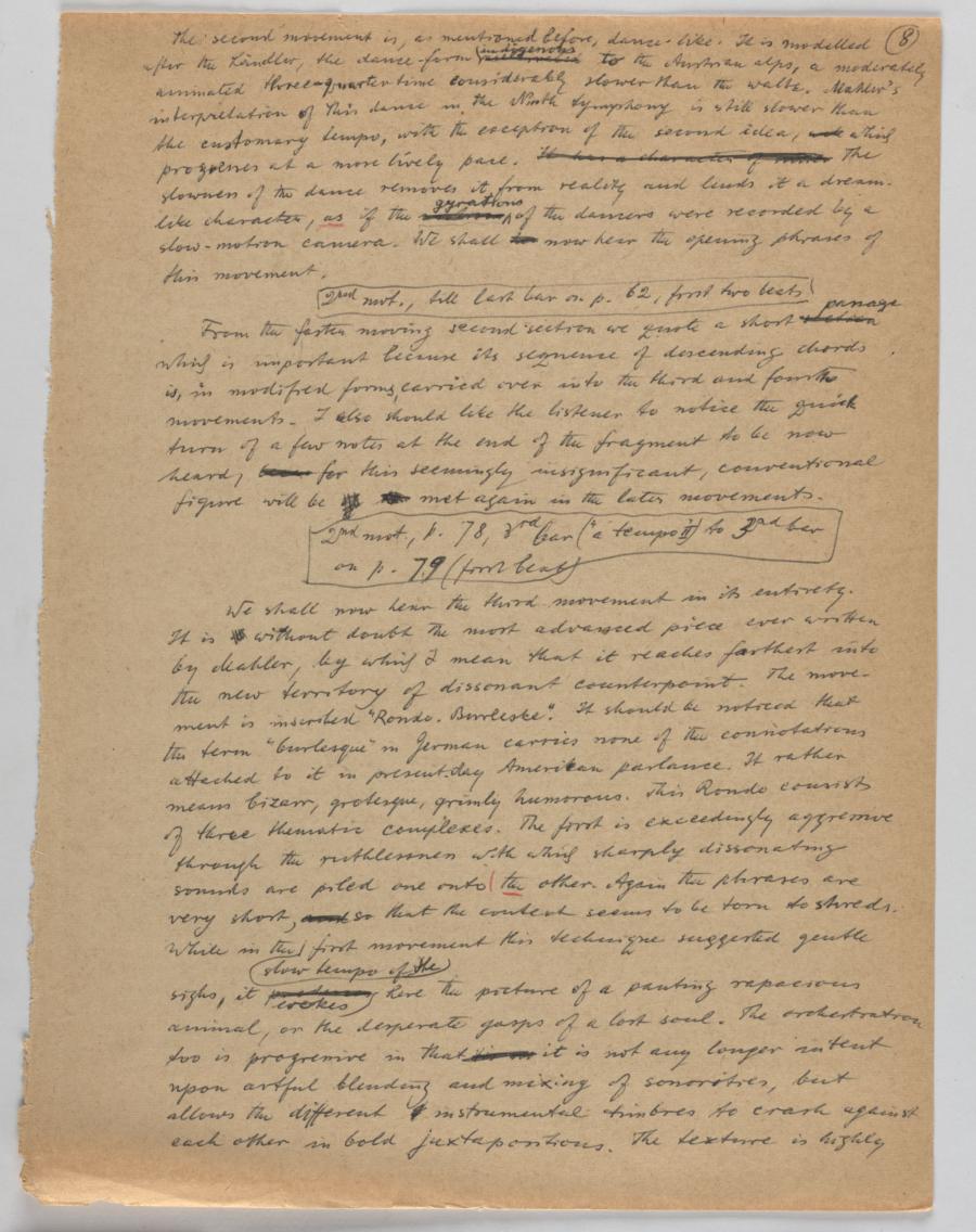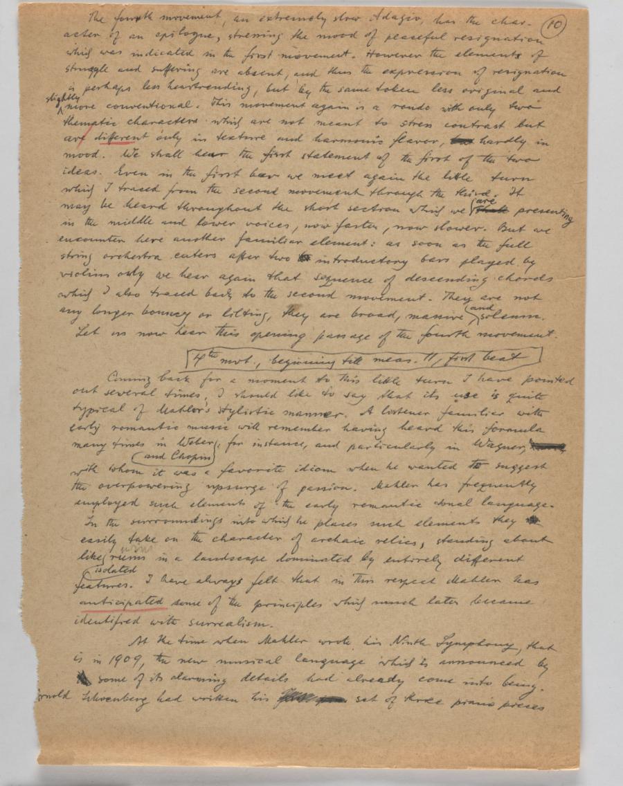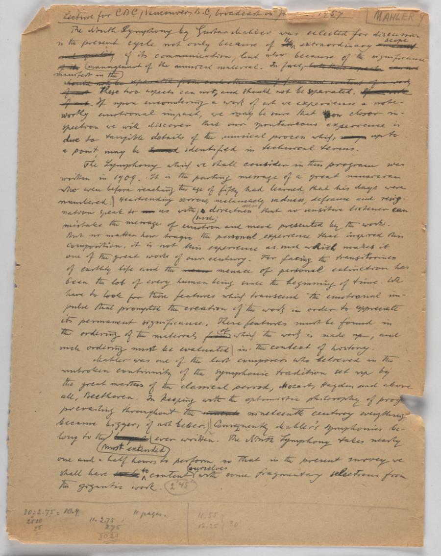 Lecture [about the Ninth Symphony of Gustav Mahler] for CBC, Vancouver, B.C., broadcast on January 20, 1957