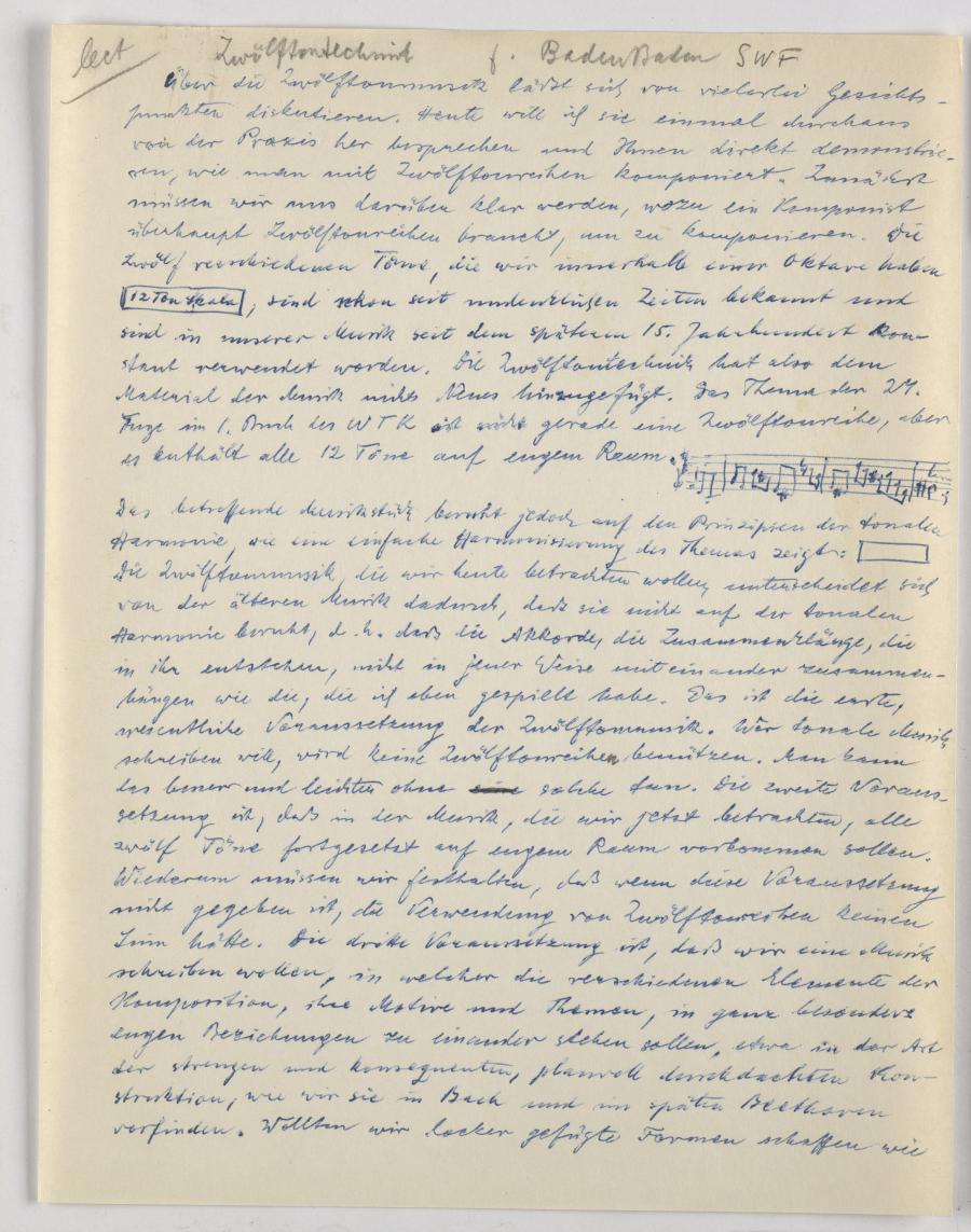 Der Vortrag wurde im September 1951 in Baden-Baden gehalten und im SWF übertragen, und stellt mit dem Fokus auf praktische Anwendung der Zwölftontechnik im Kompositionsprozess eine inhaltliche Ergänzung zu dem wenige Tage zuvor in Berlin gehaltenen Vortrag über das „Schicksal der Zwölftontechnik“. [vgl. LM 216]