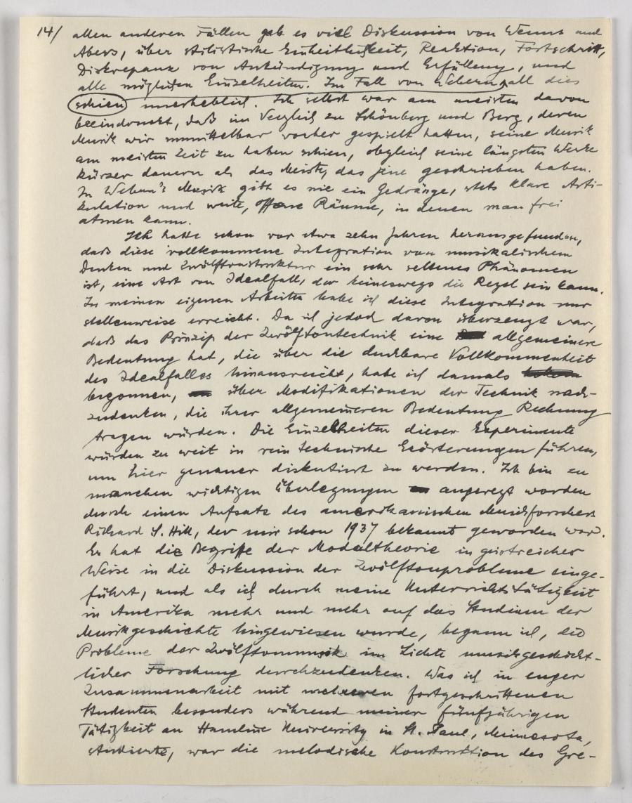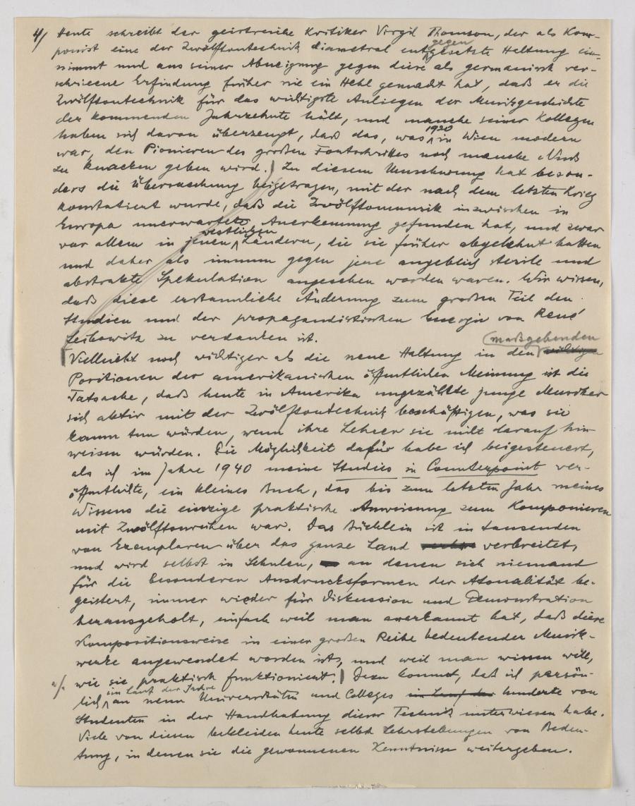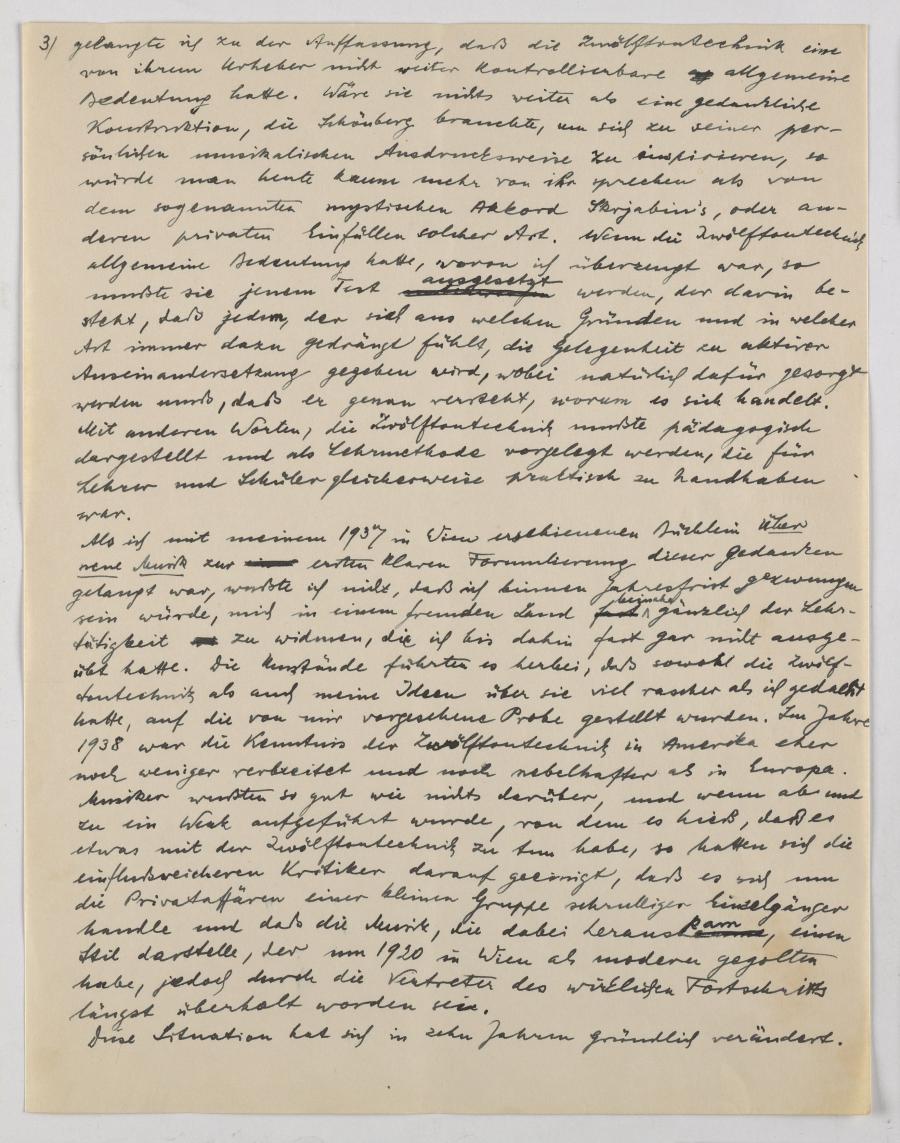Im Überblick stellt er in diesem, kurz nach Schönbergs Tod in Los Angeles geschriebenen Vortrag die unterschiedlichen persönlichen Schreibweisen und Anwendungen der Zwölftontechnik von Schönberg, Berg, Webern und Kreneks eigener Werke vor und bemüht sich um historische Verortung in der musikgeschichtlichen Entwicklung einschließlich einer in die Zukunft reichenden Perspektive.